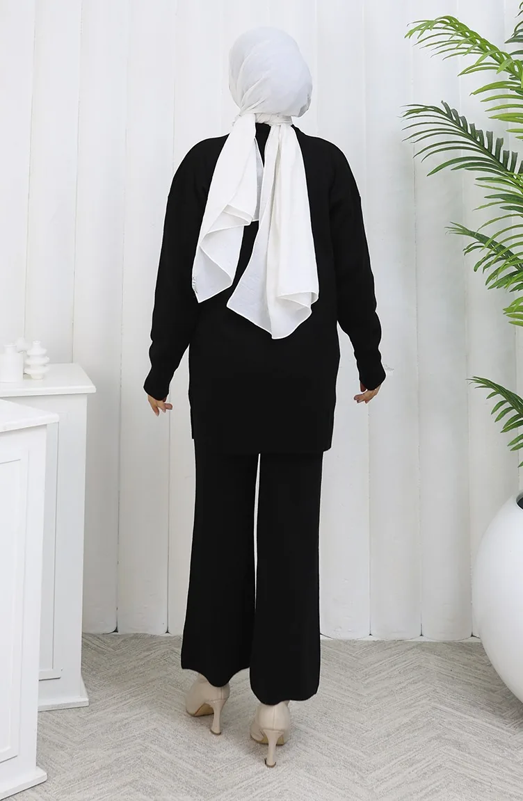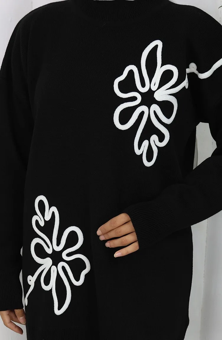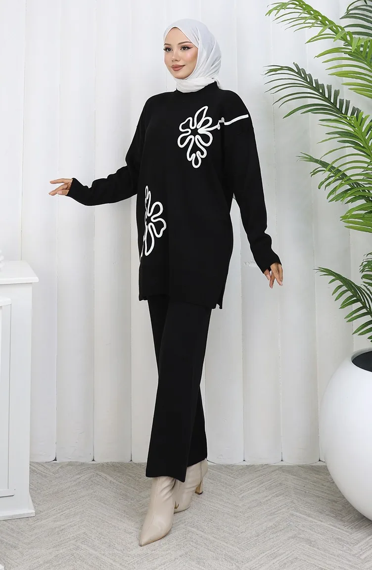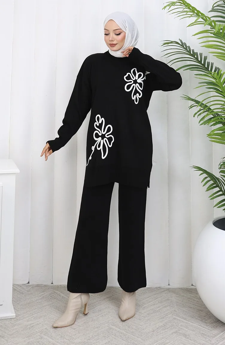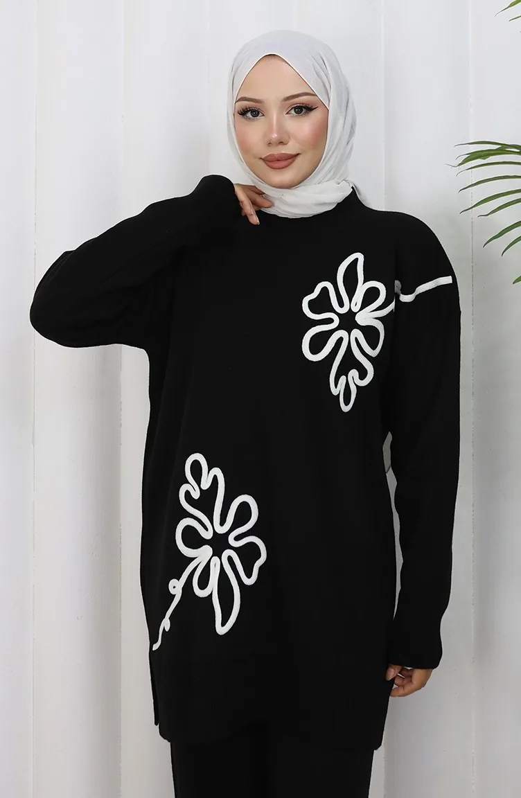 Gebreid Bloemenpatroon Tuniek Broek Tweedelig Pak 1110-03 Zwart 1110-03