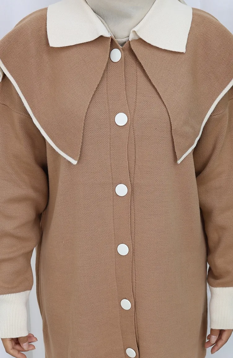 Designed by Acrylic fabric. It has a plain appearance. Buttons have been used to make it easy to use. Designed from thick fabric. The size worn by the model, is the one on the image.