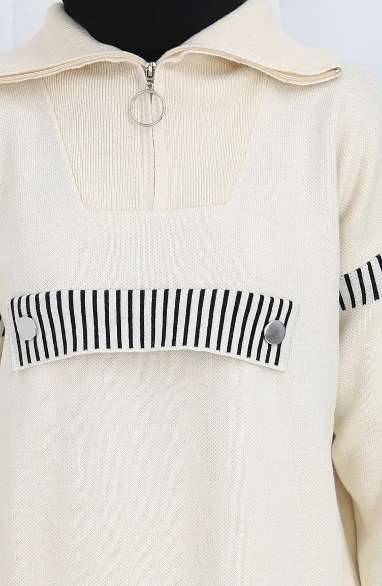 Gebreid Opstaand Kraag Tuniek Broek Tweedelig Pak 1105-03 Beige 1105-03
