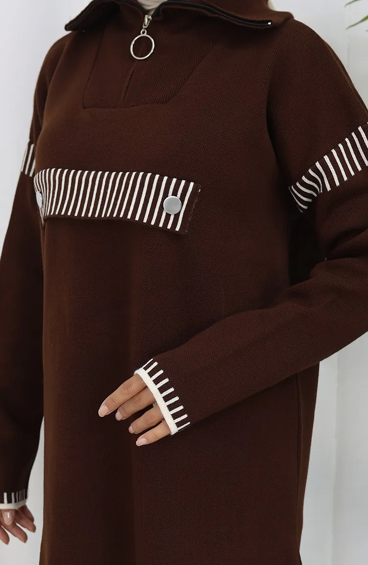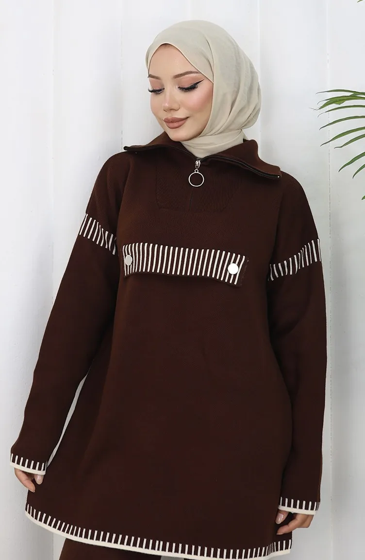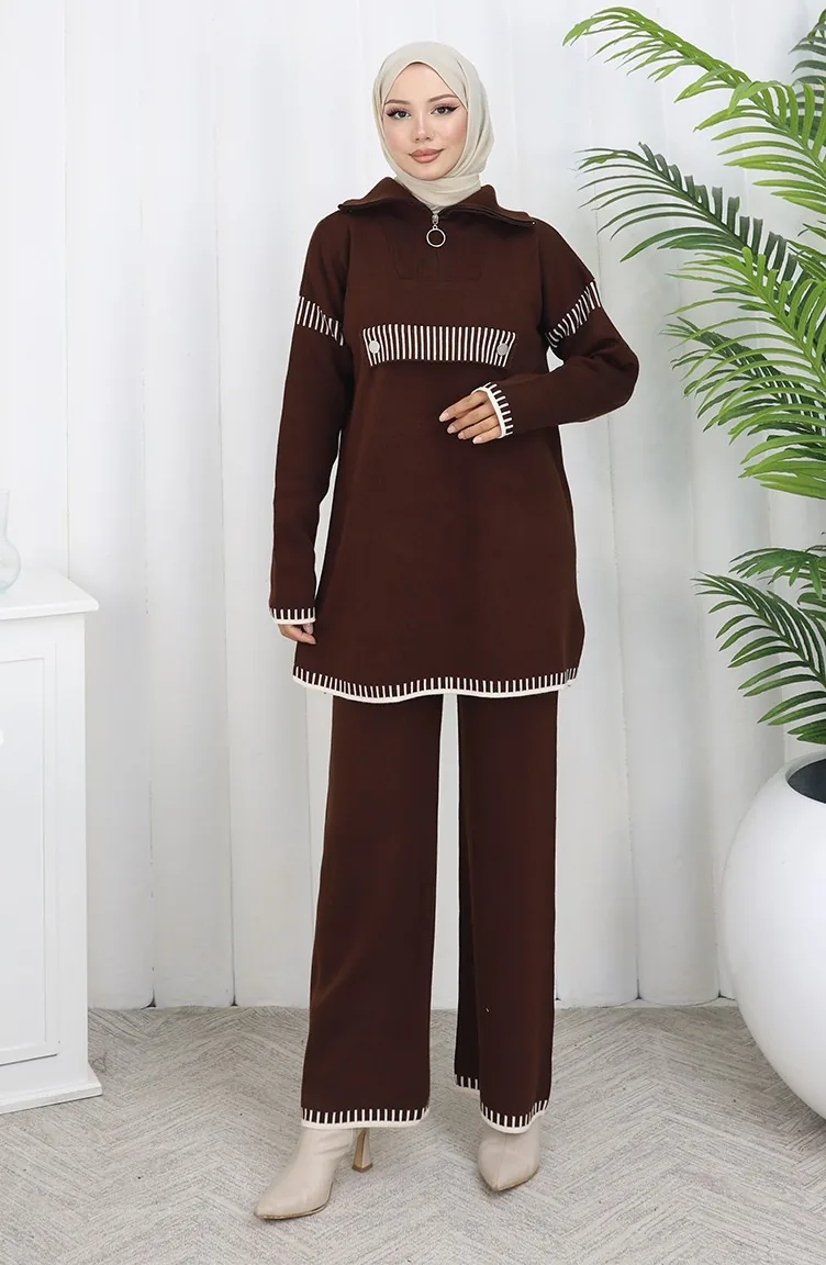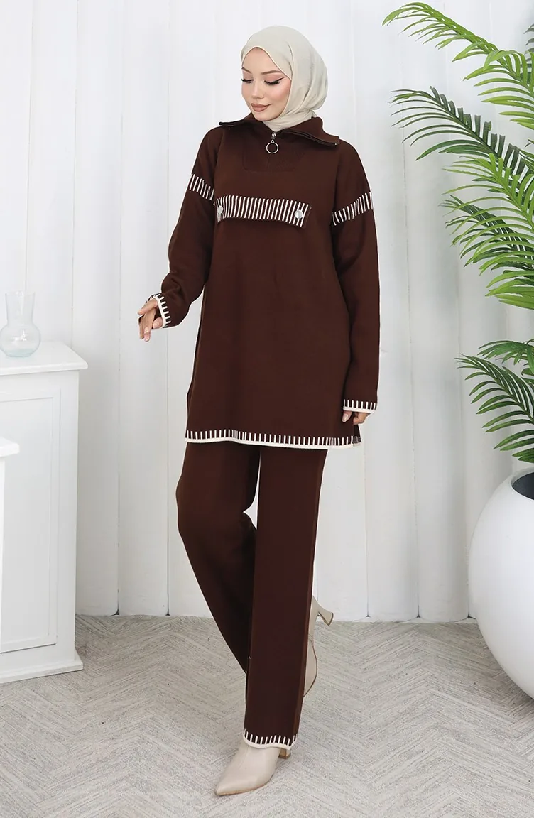 Gebreid Opstaand Kraag Tuniek Broek Tweedelig Pak 1105-04 Bruin 1105-04