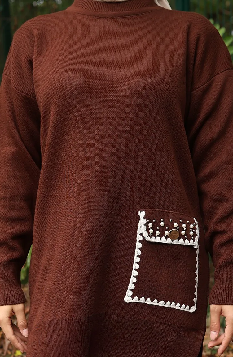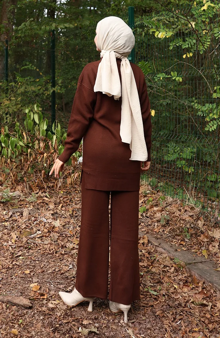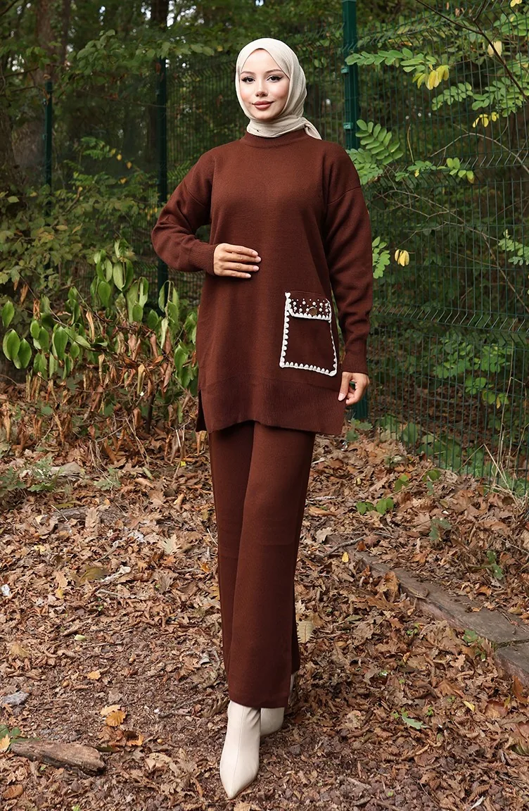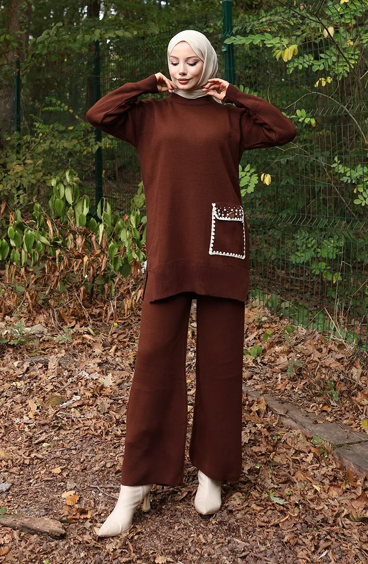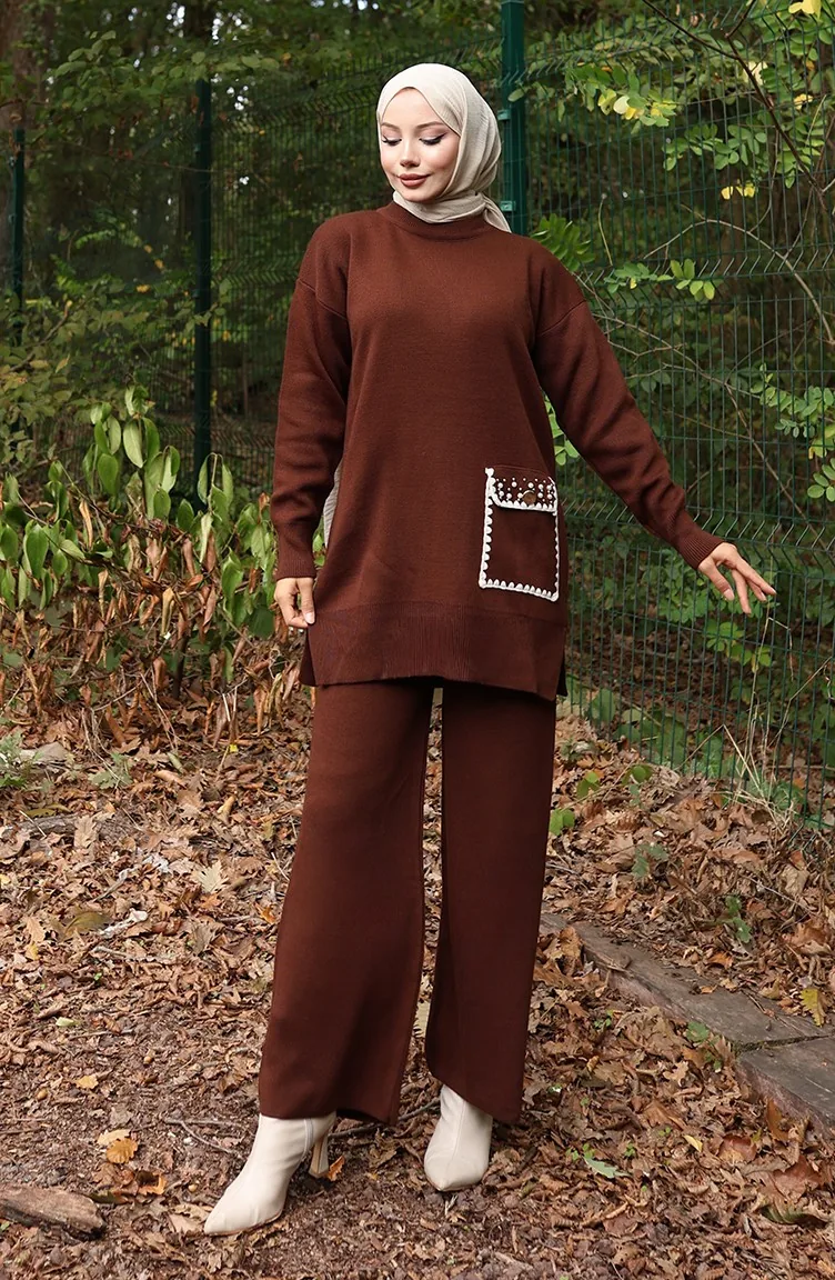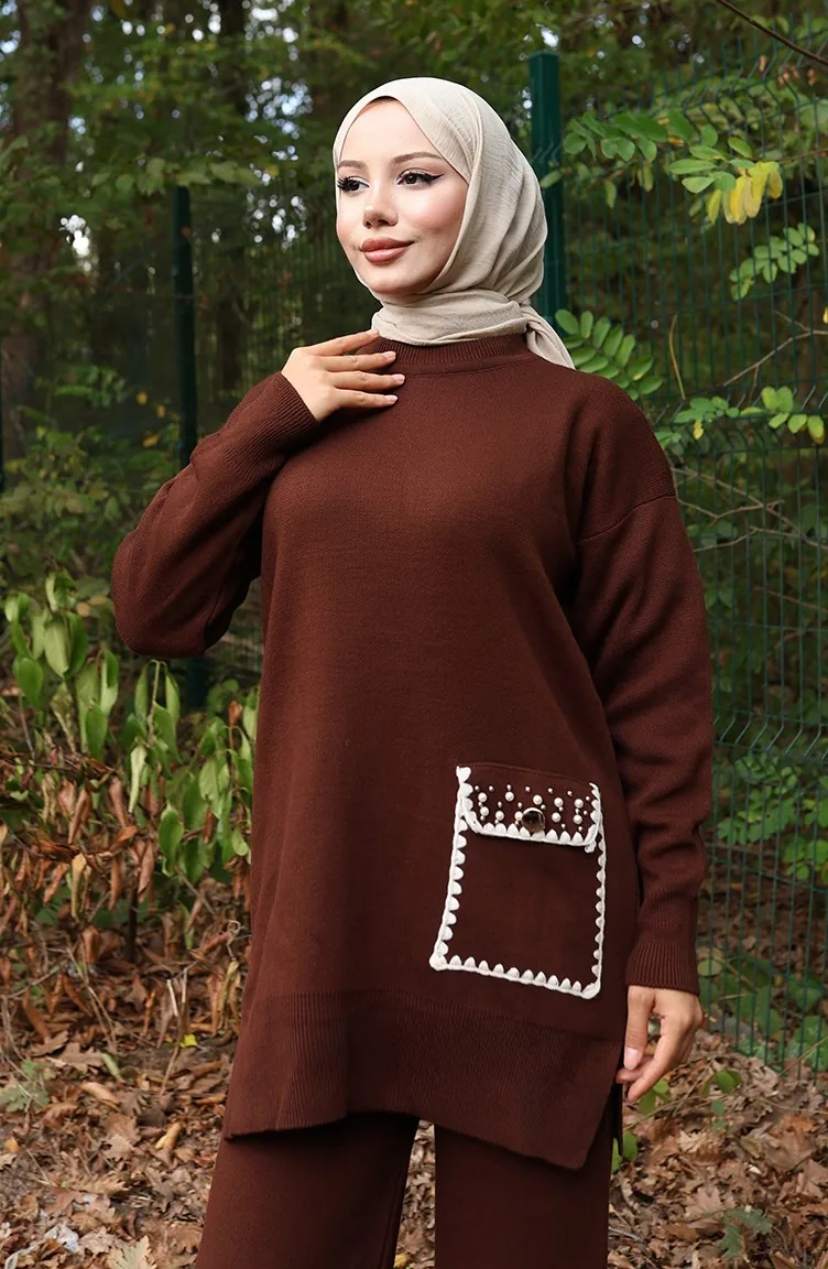 Gebreid Parelmoer Gedetailleerd Tuniek Broek Tweedelig Pak 1025-06 Bruin 1025-06
