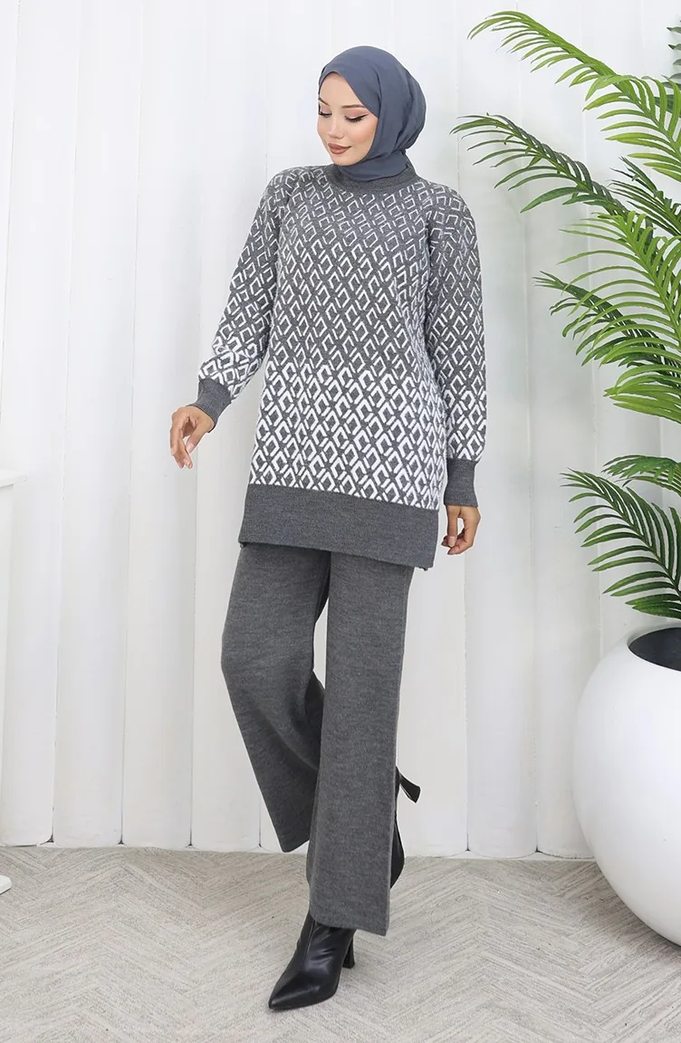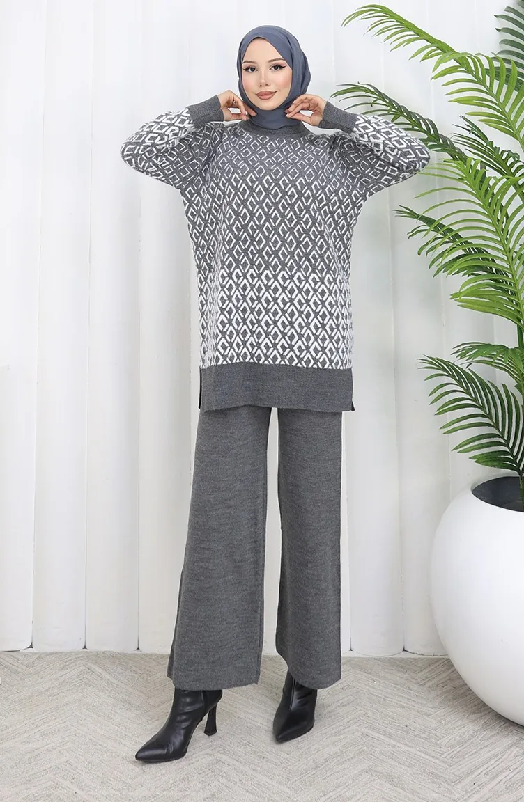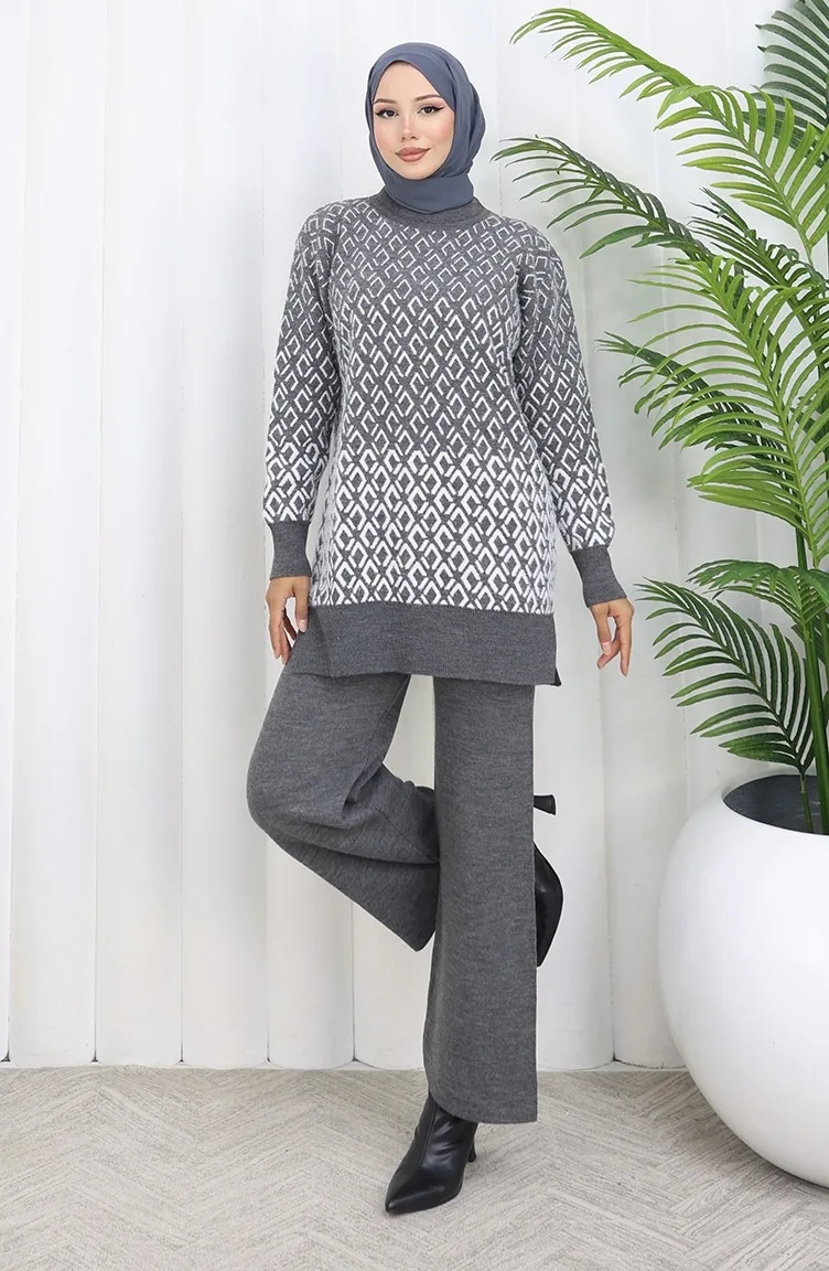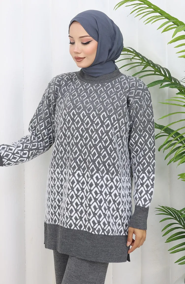 Gebreid Patroon Tuniek Broek Tweedelig Pak 1085-02 Grijs 1085-02