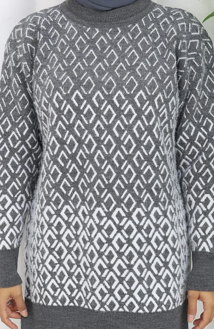 Gray color is used. Designed by Acrylic fabric. Designed with patterned fabric. When the tunic combined with another product, you will get a nice suit. Designed from thick fabric. The size worn by the model, is the one on the image.