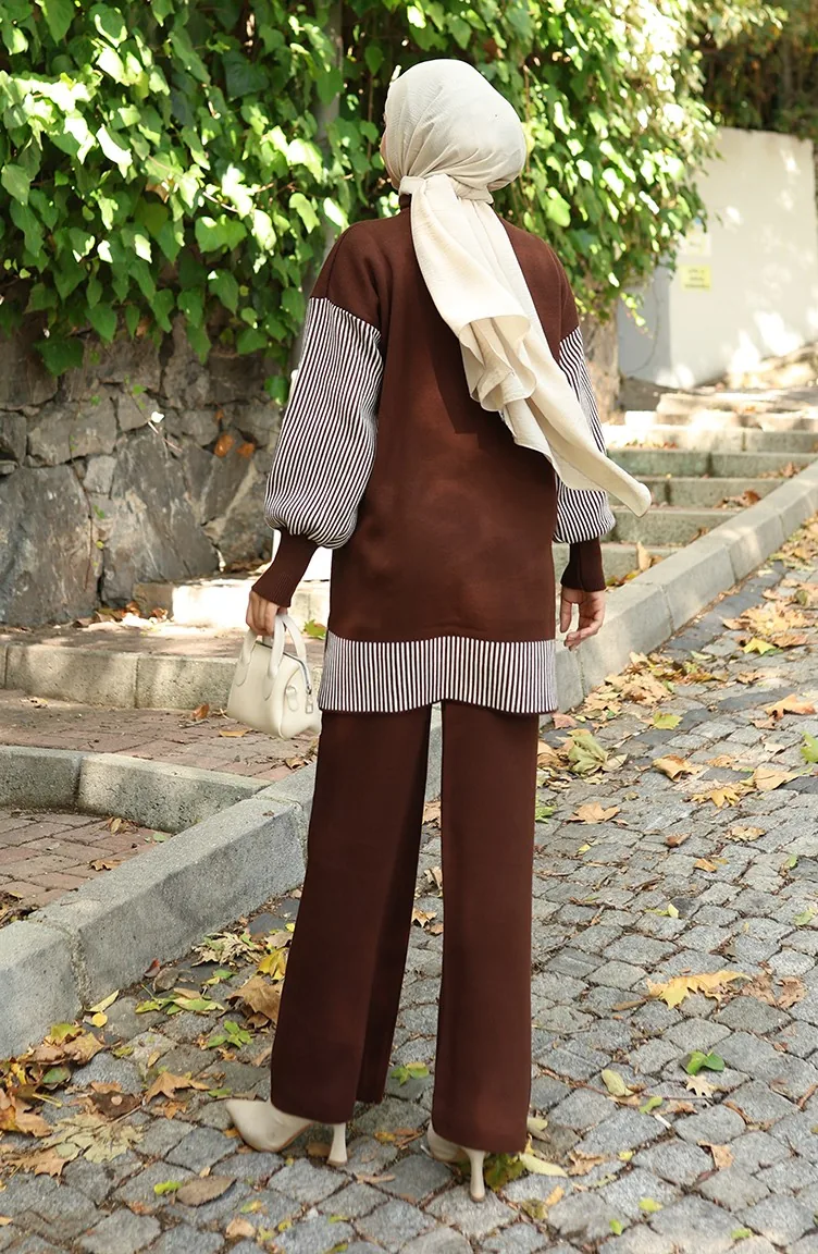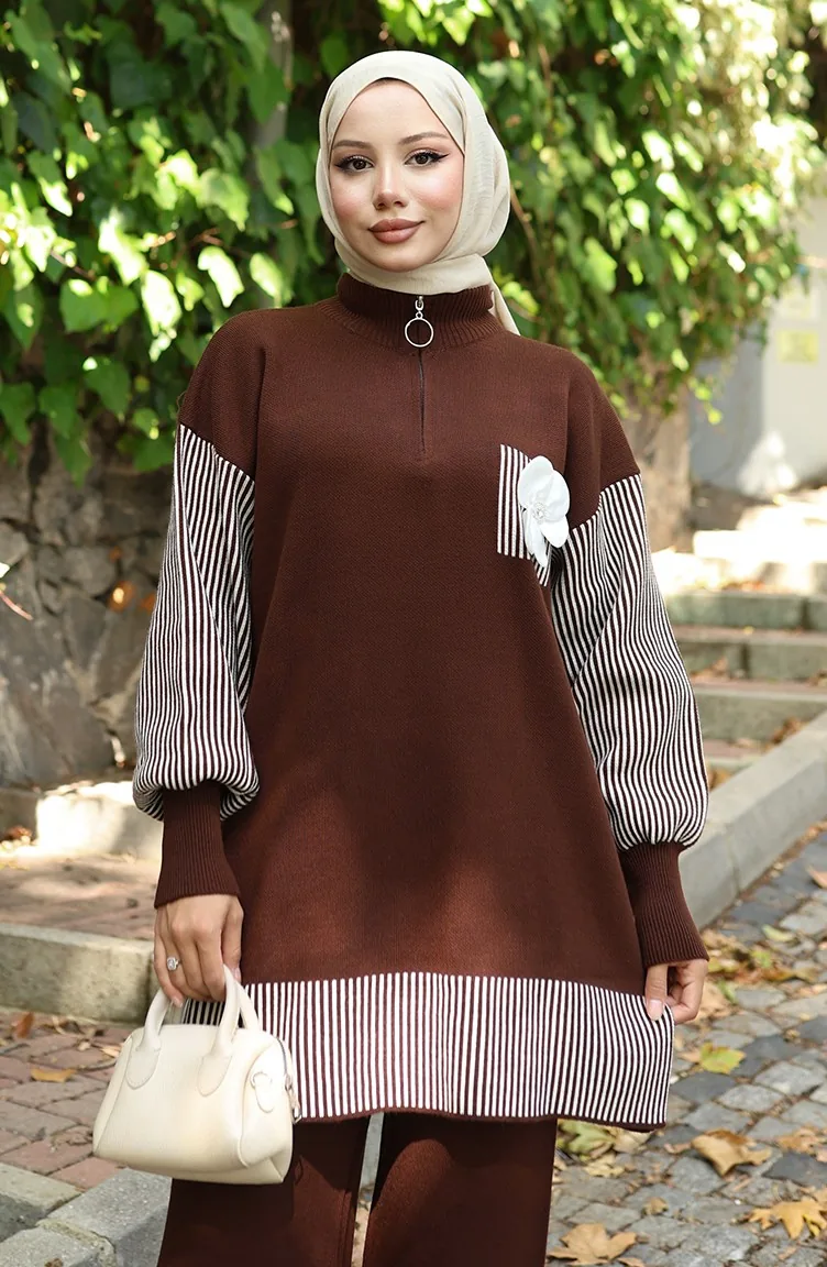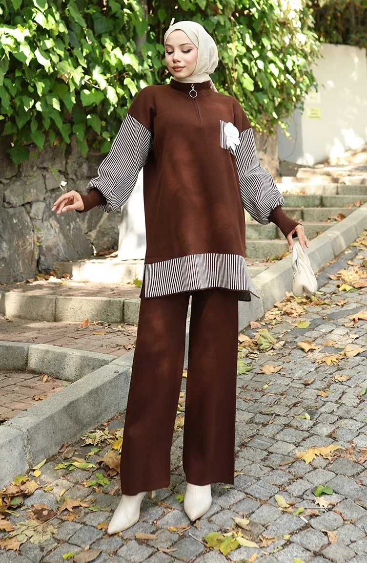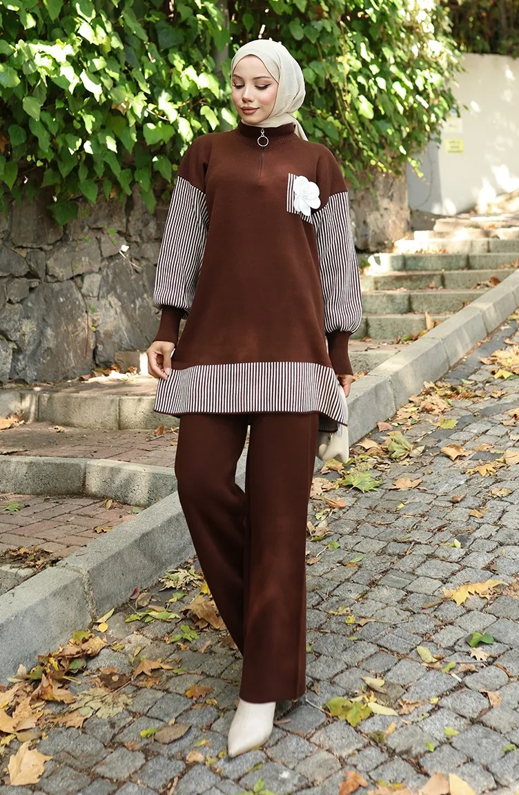 Gebreide Bloemenapplicatie Tuniek Broek Tweedelig Pak 1009-03 Bruin 1009-03