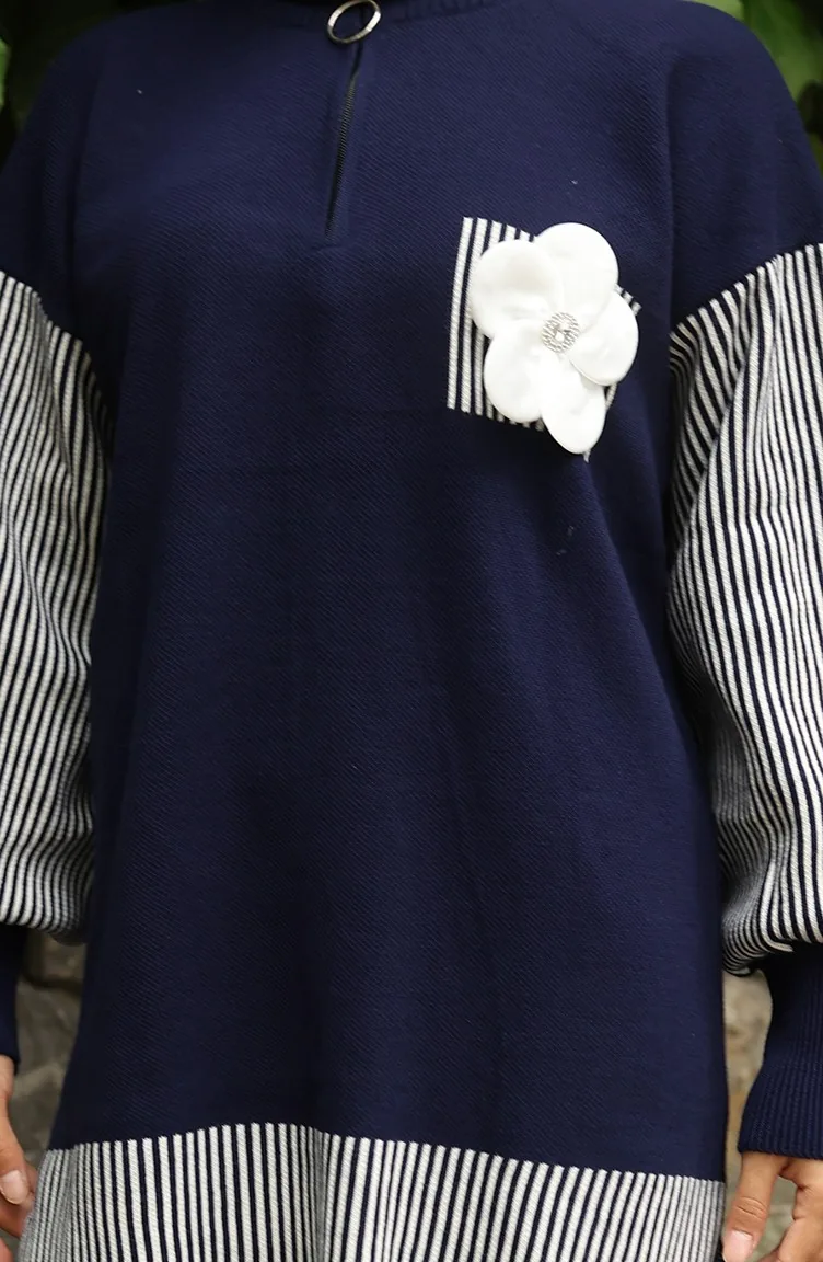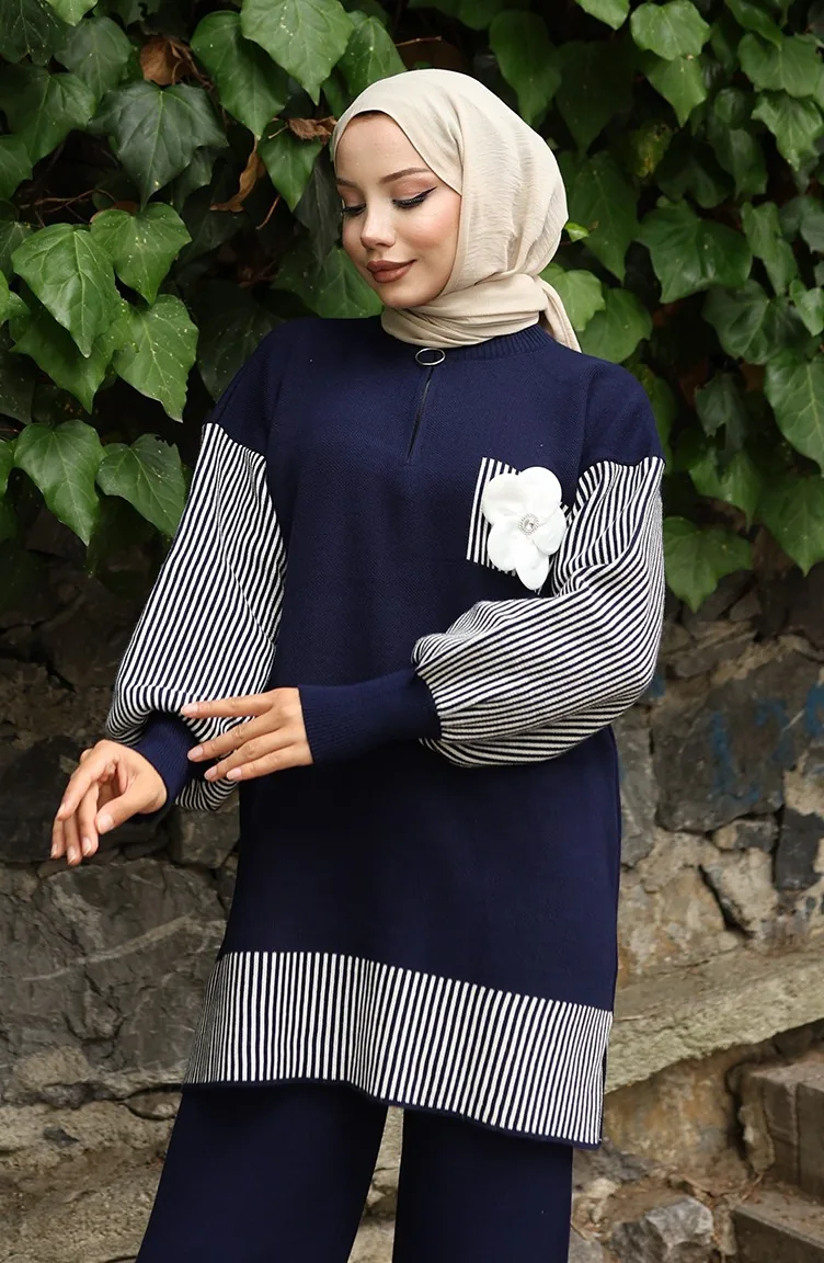Gebreide Bloemenapplicatie Tuniek Broek Tweedelig Pak 1009-08 Marineblauw 1009-08