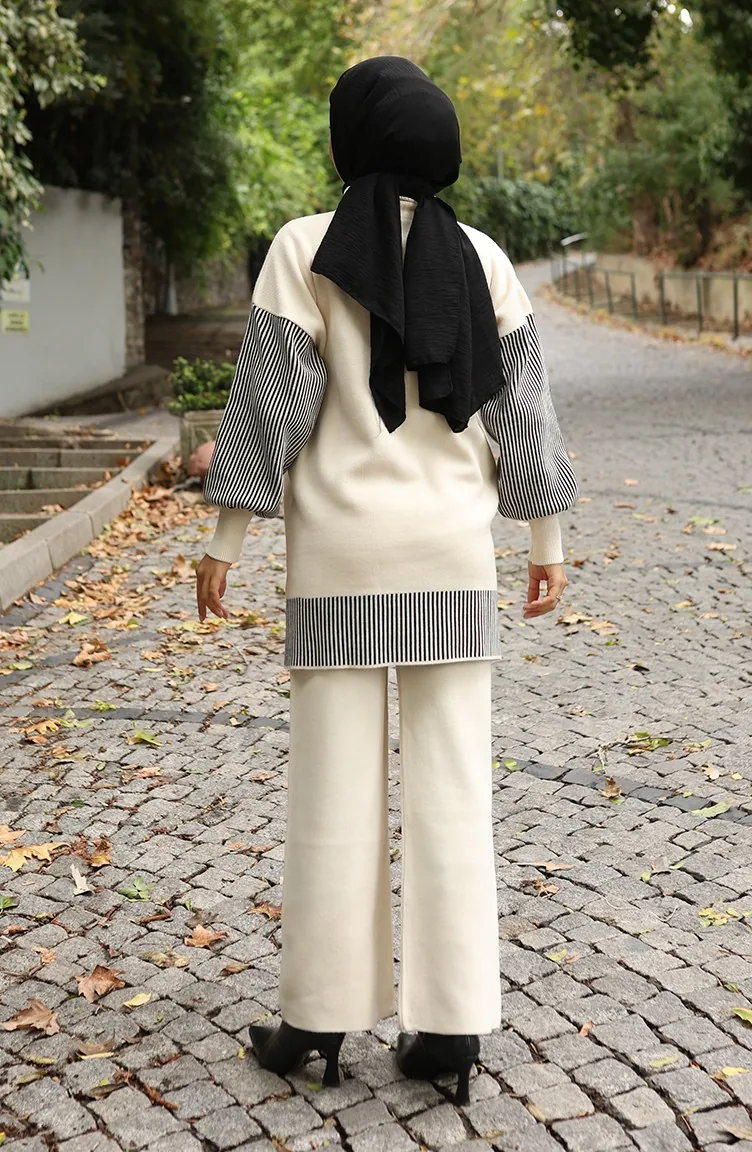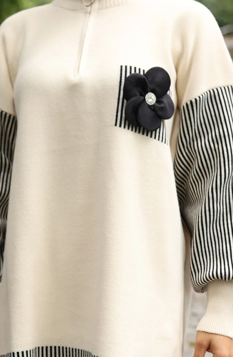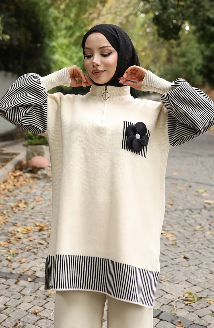 Gebreide Bloemenapplicatie Tuniek Broek Tweedelig Set 1009-05 Beige 1009-05