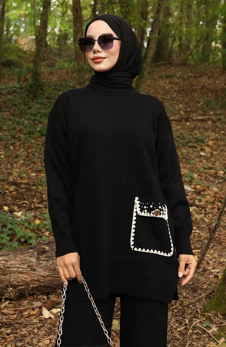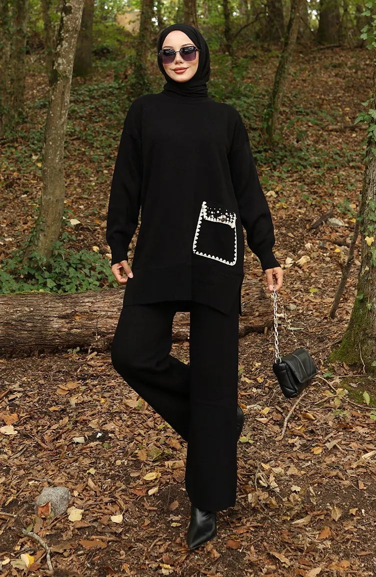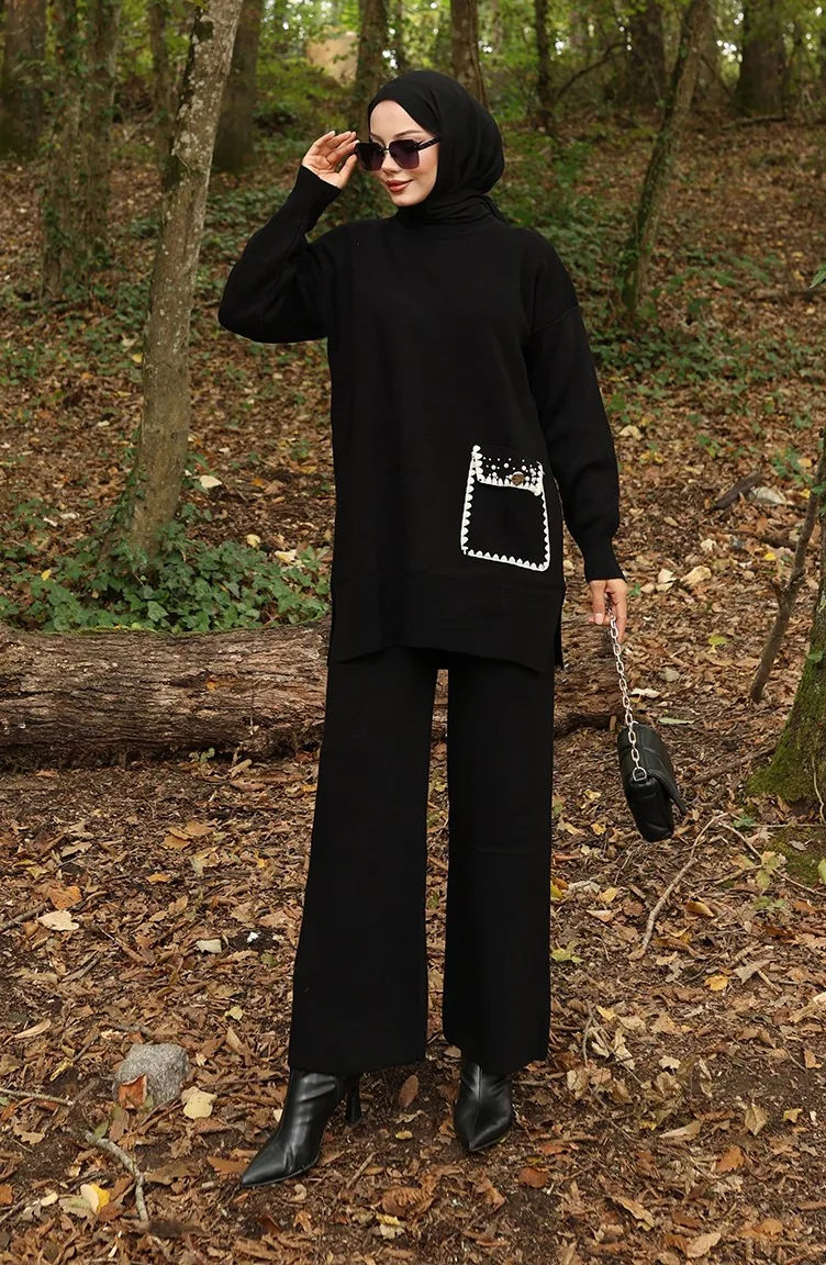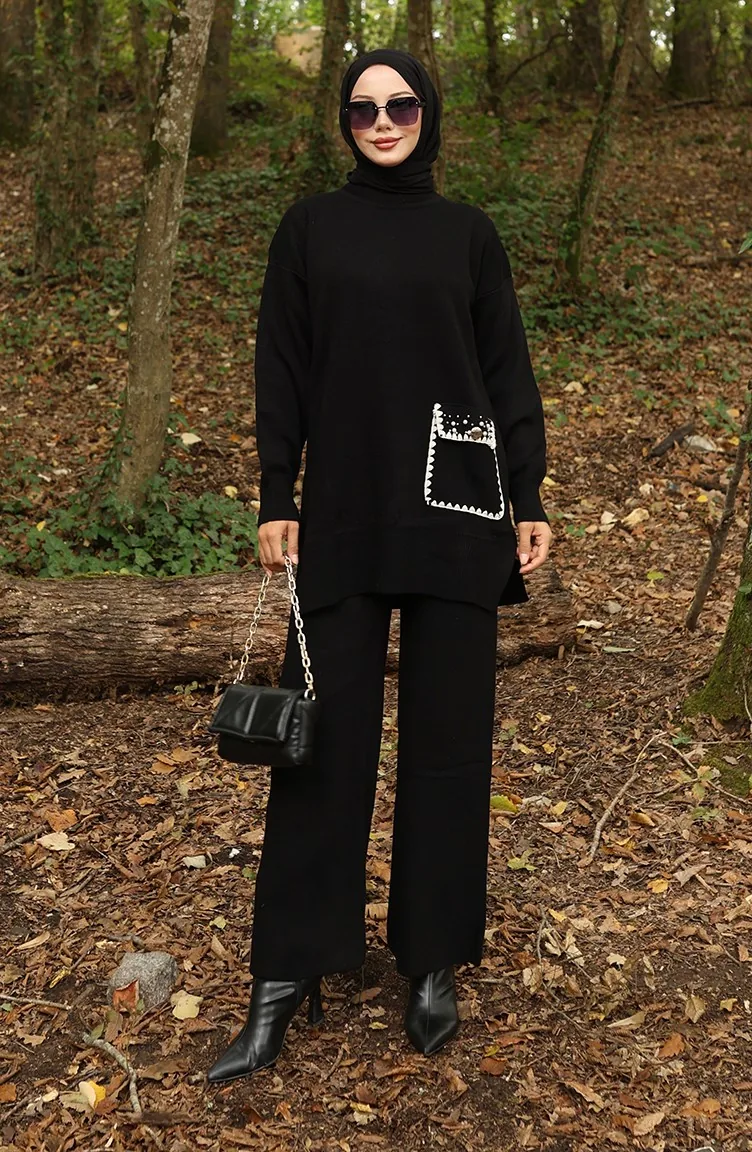 Gebreide Parelmoeren Tuniekbroek Tweedelig Set 1025-02 Zwart 1025-02