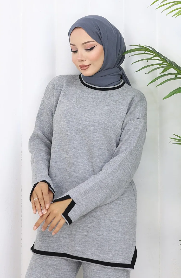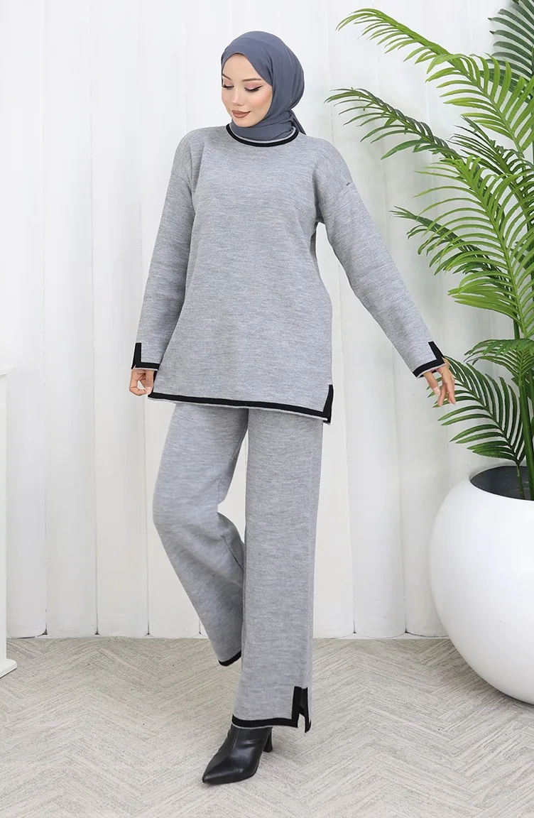 Gebreide Trui Met Split En Broek Tweedelig Set 0011-01 Grijs 0011-01