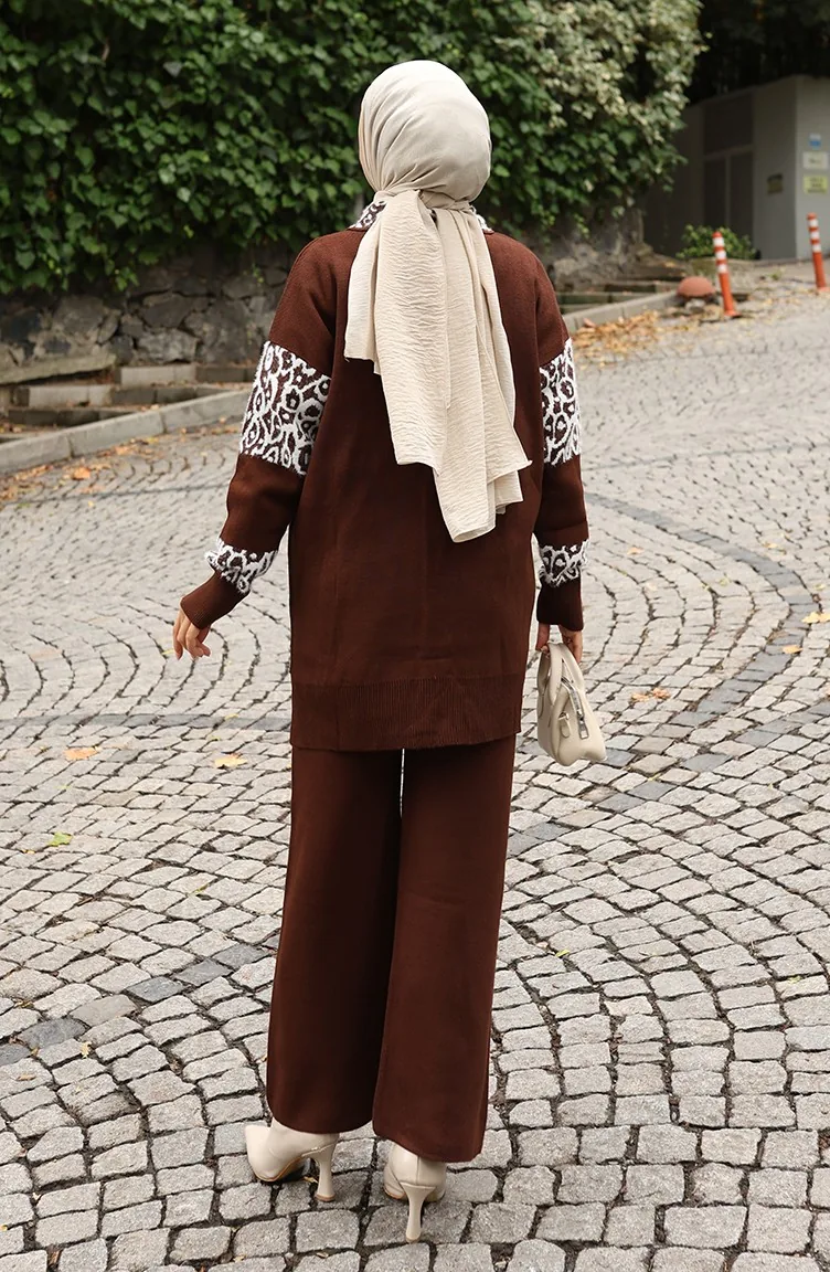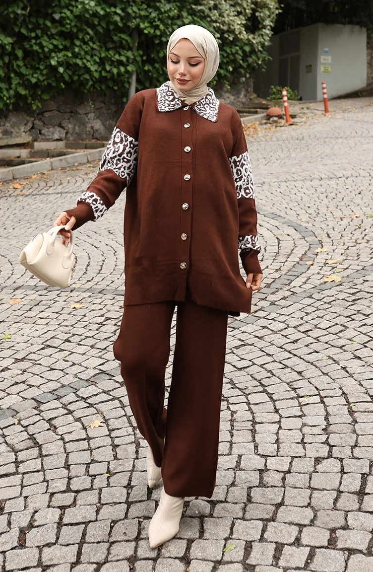 Gebreide Tuniek Met Knopen En Garneringen Tweedelig Pak 1020-03 Bruin 1020-03