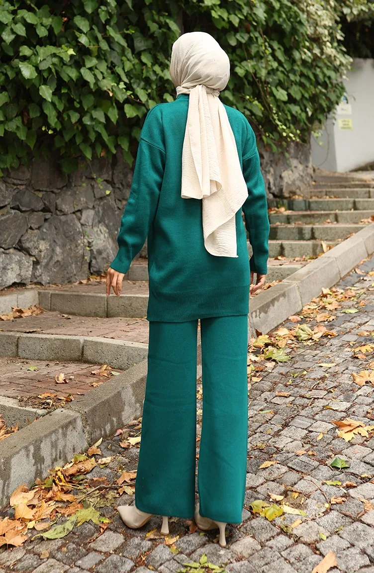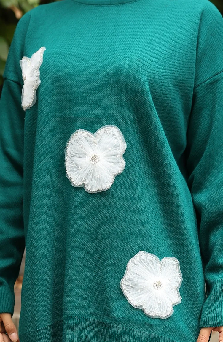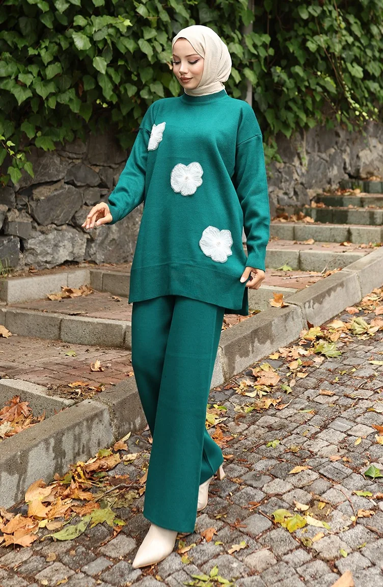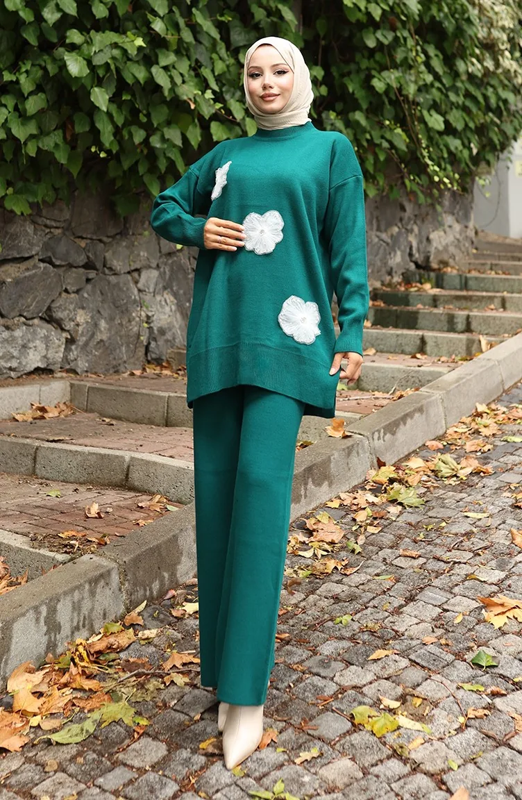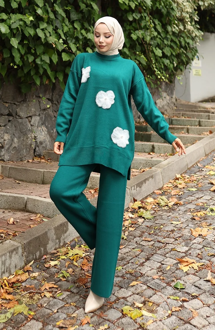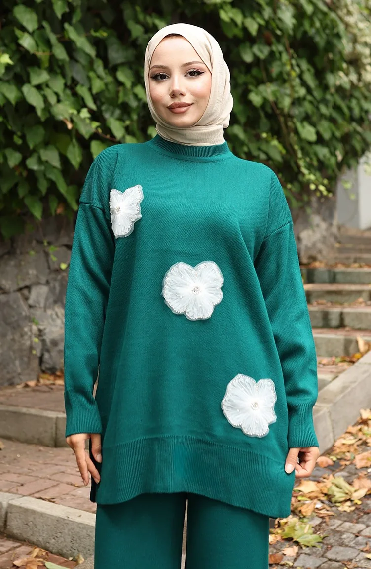 Gebreide Tuniek Met Kralenborduursel Tweedelig Setje 1016-07 Petrol 1016-07