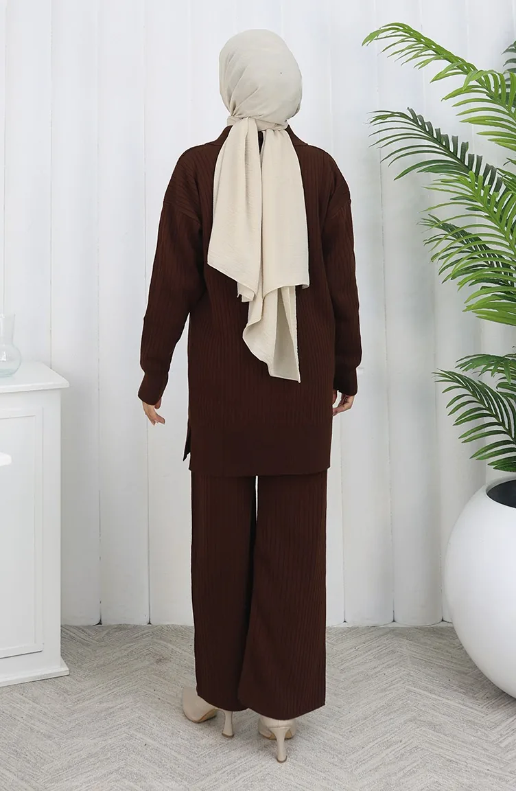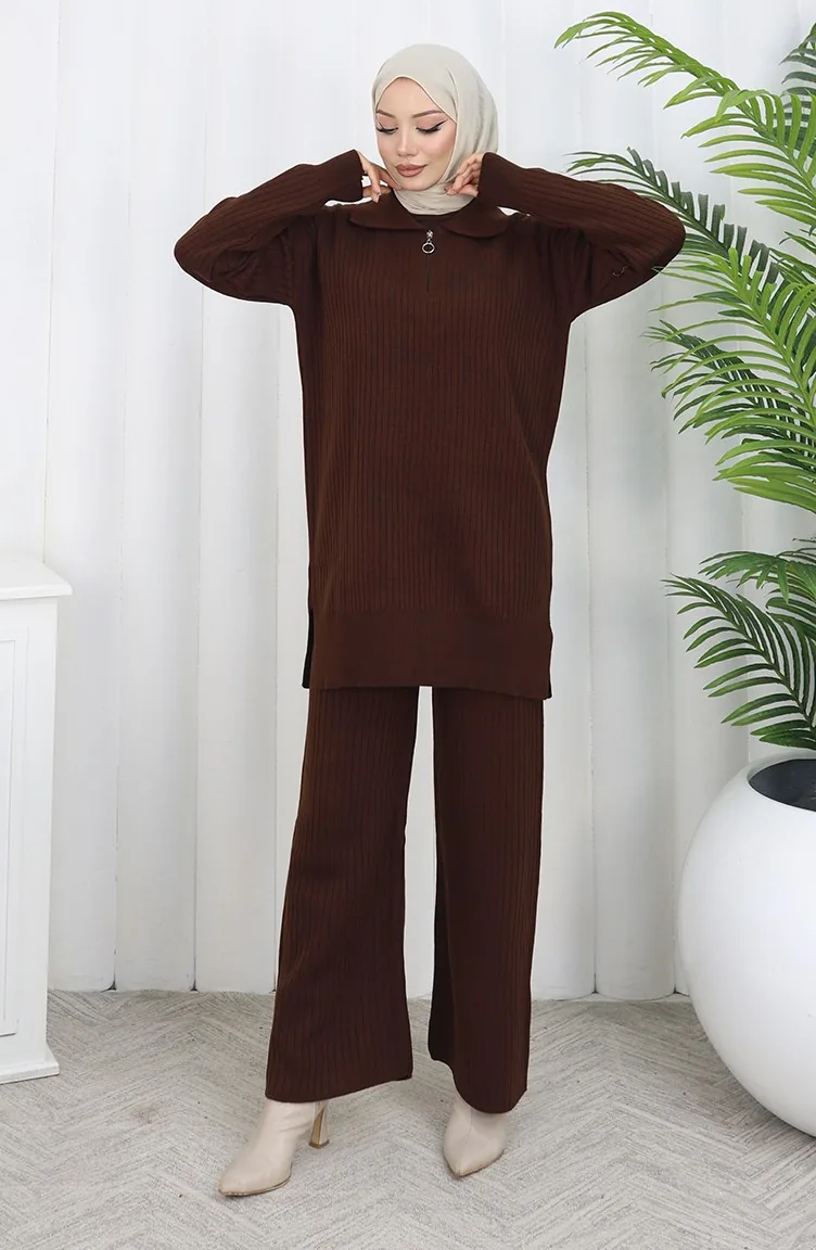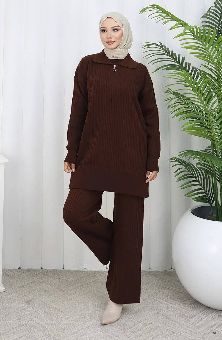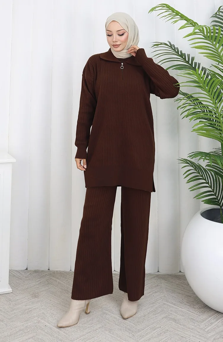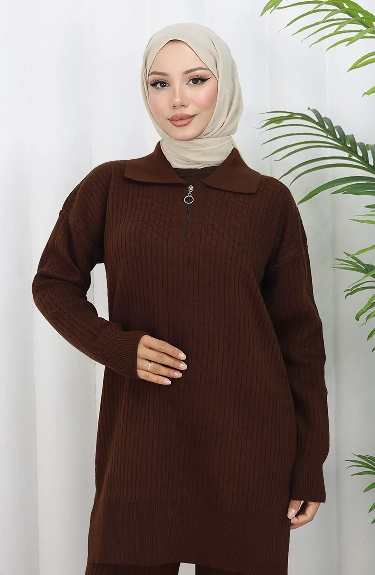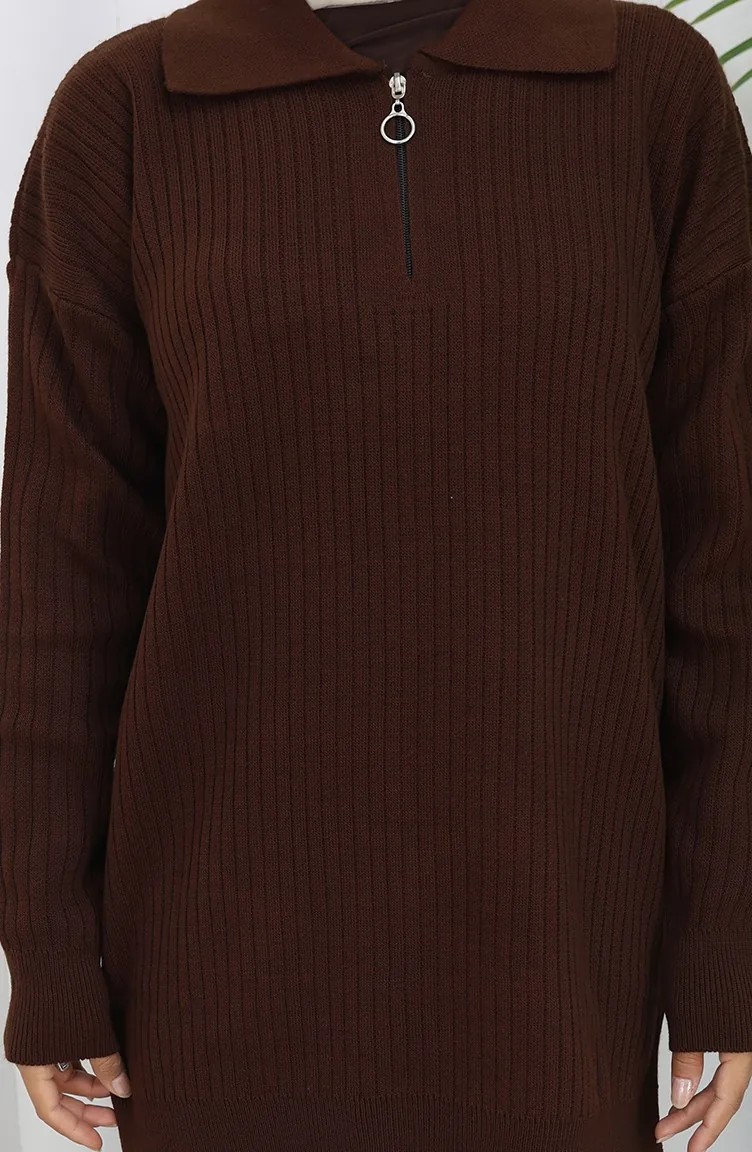 Gebreide Tuniek Met Rits En Strepen Tweedelig Pak 1073-02 Bruin 1073-02