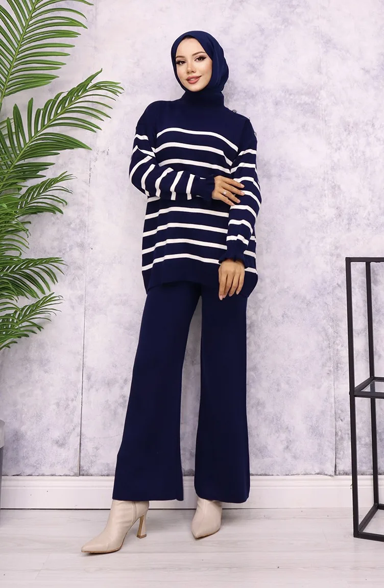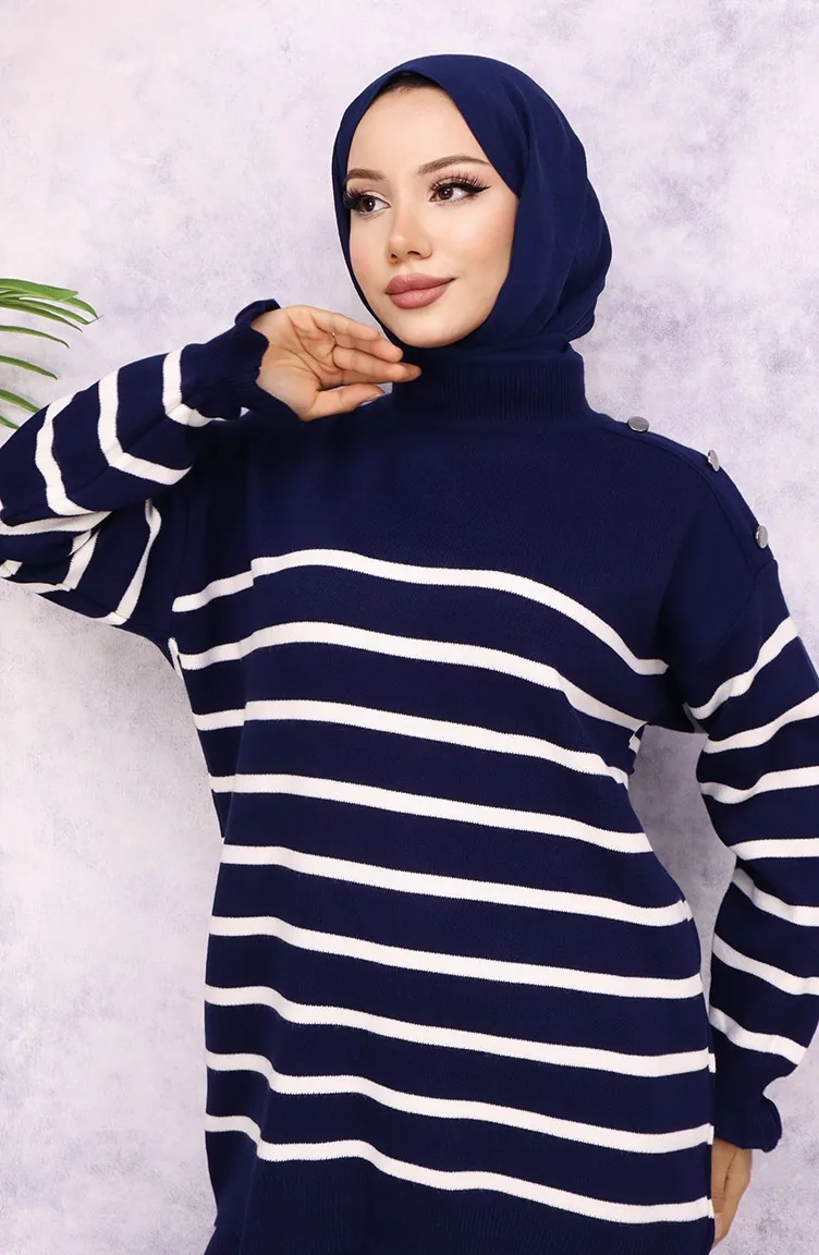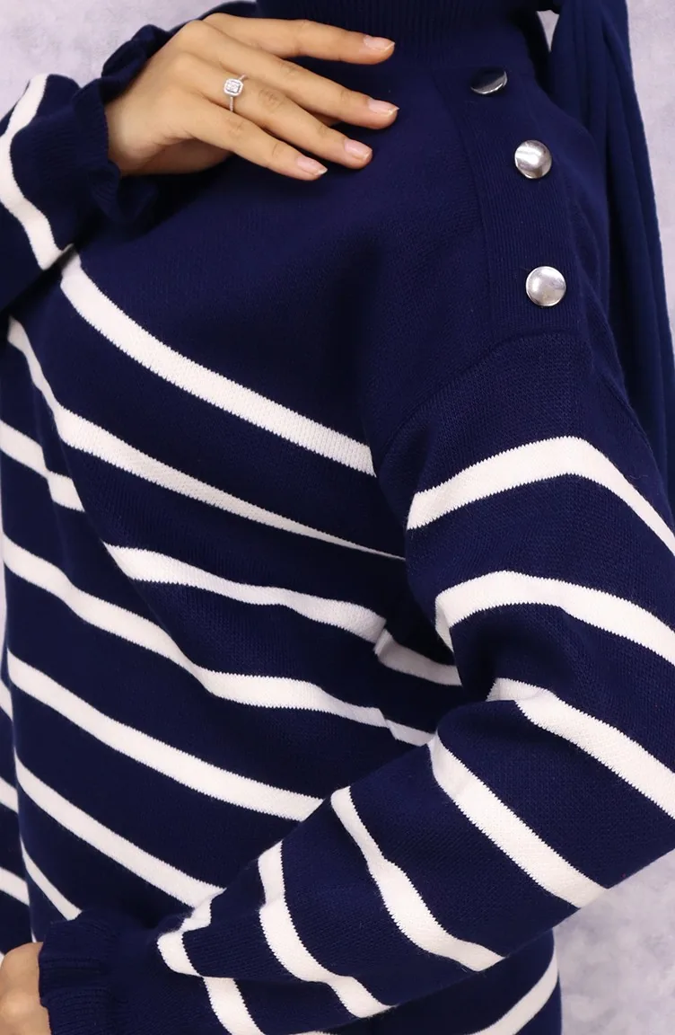 Gestreept Gebreide Pak Met Knoopjes Op De Schouder 24019-01 Marineblauw 24019-01