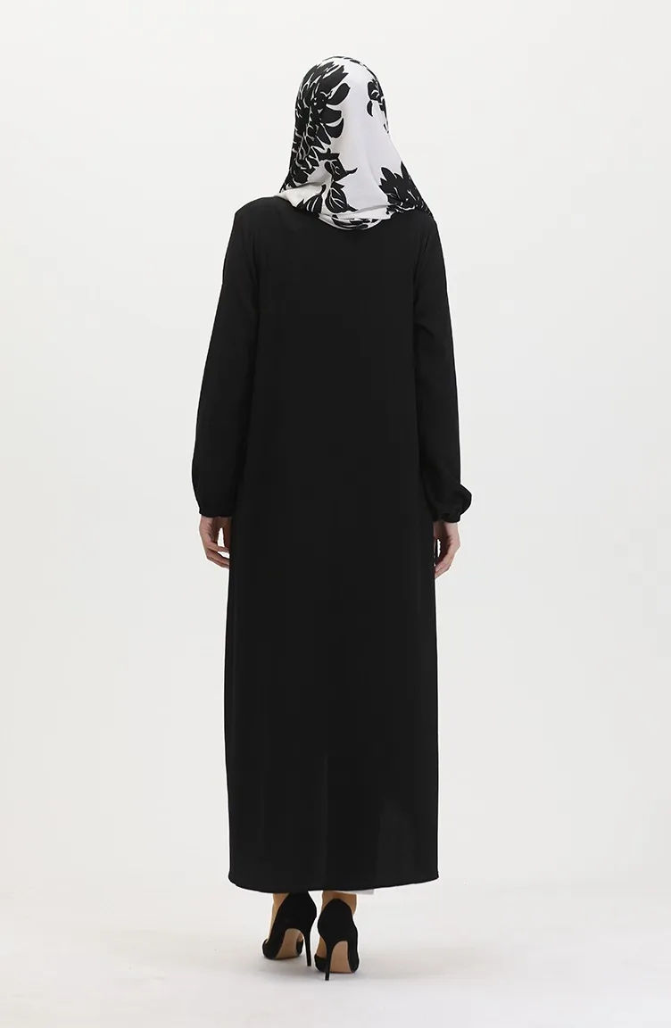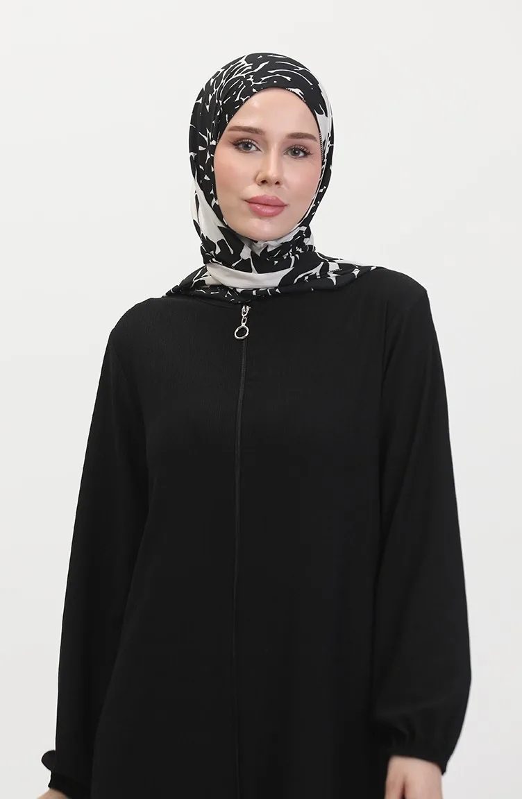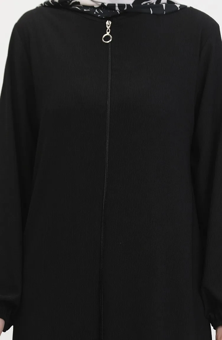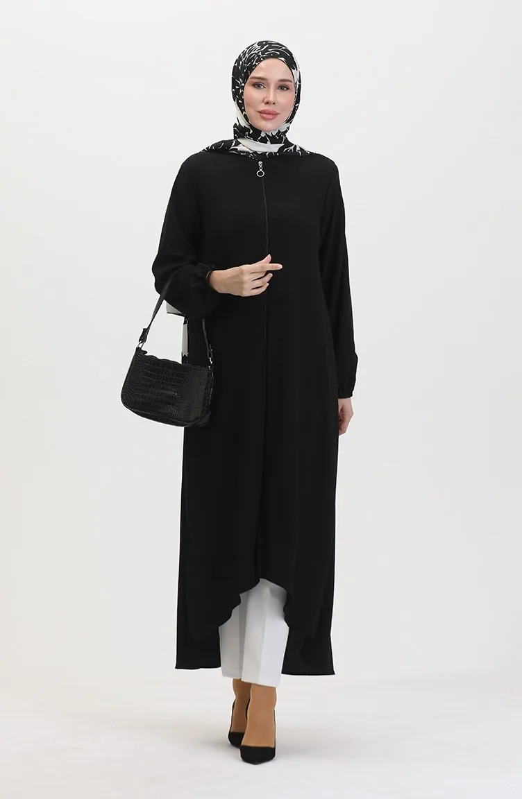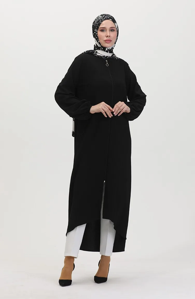Black color is used. Designed by Gauze fabric. It has a plain appearance. Zipper is used for easy handling. It's made of elastic sleeves. The Zero collar is preferred for all types of clothing. Suitable for 4 seasons. Plus size option available.
