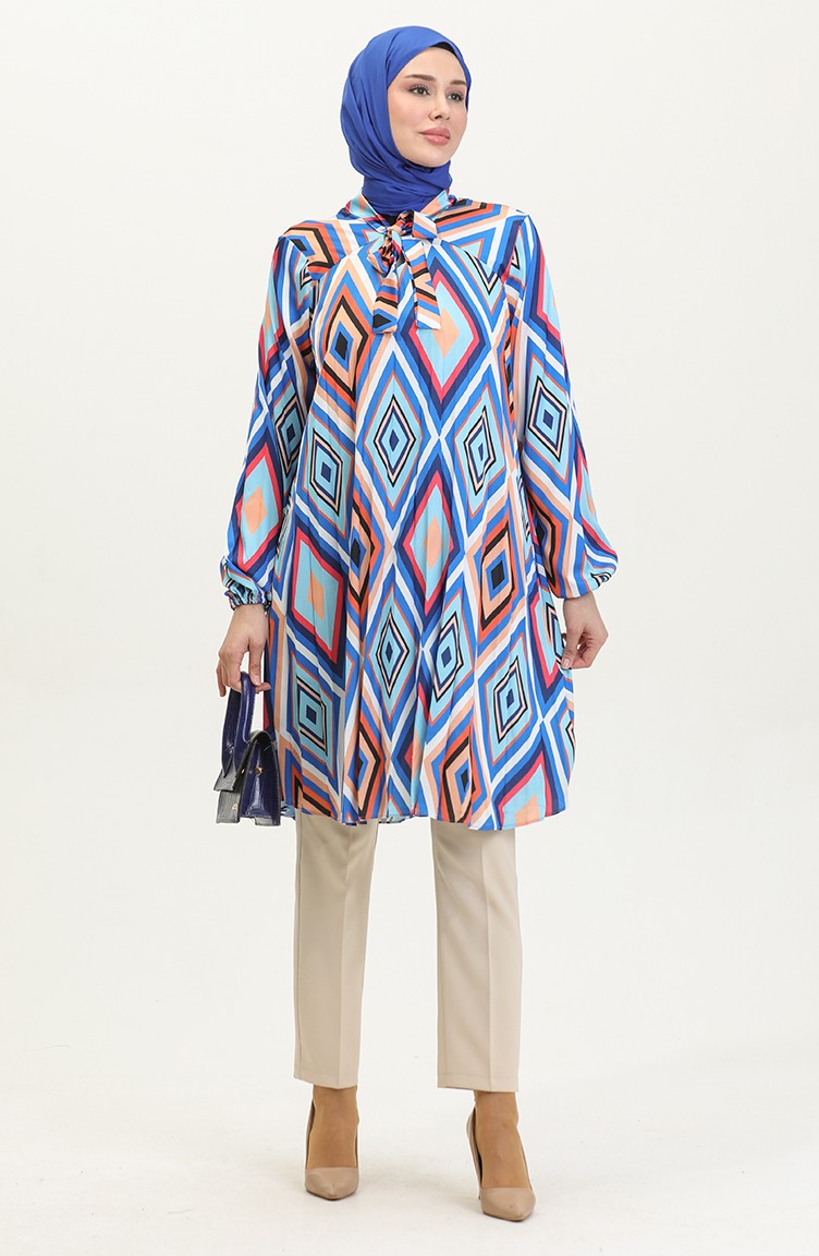 Grote Maat Satijnen Tuniek Met Patroon Blauw T1456 1087
