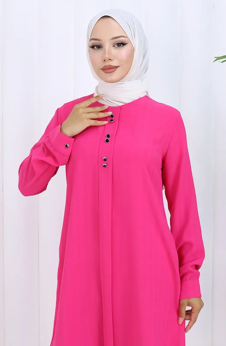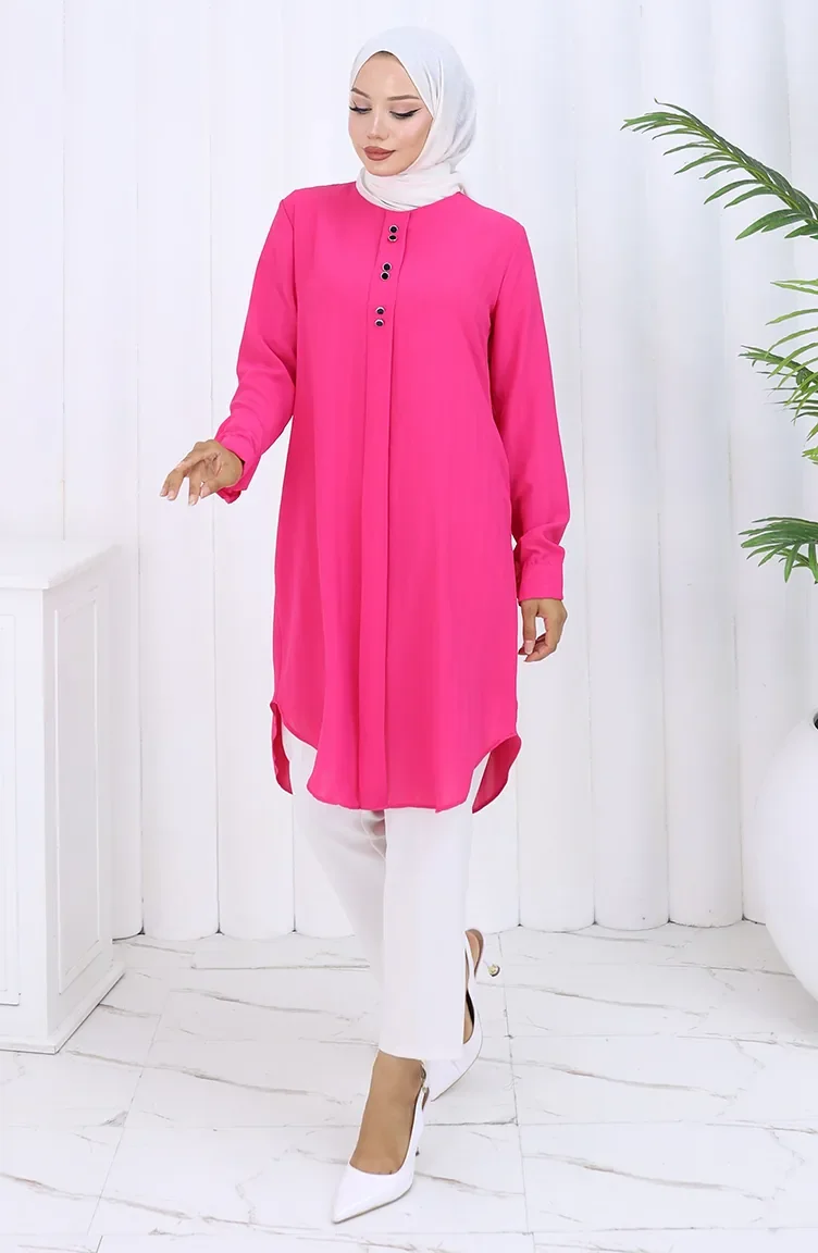 Fuchsia color is used. It has a plain appearance. Buttons have been used to make it easy to use. The Zero collar is preferred for all types of clothing. Suitable for 4 seasons. Plus size option available.