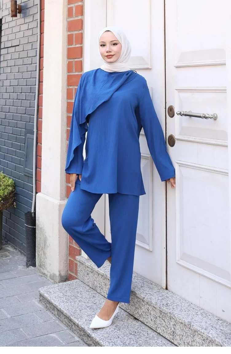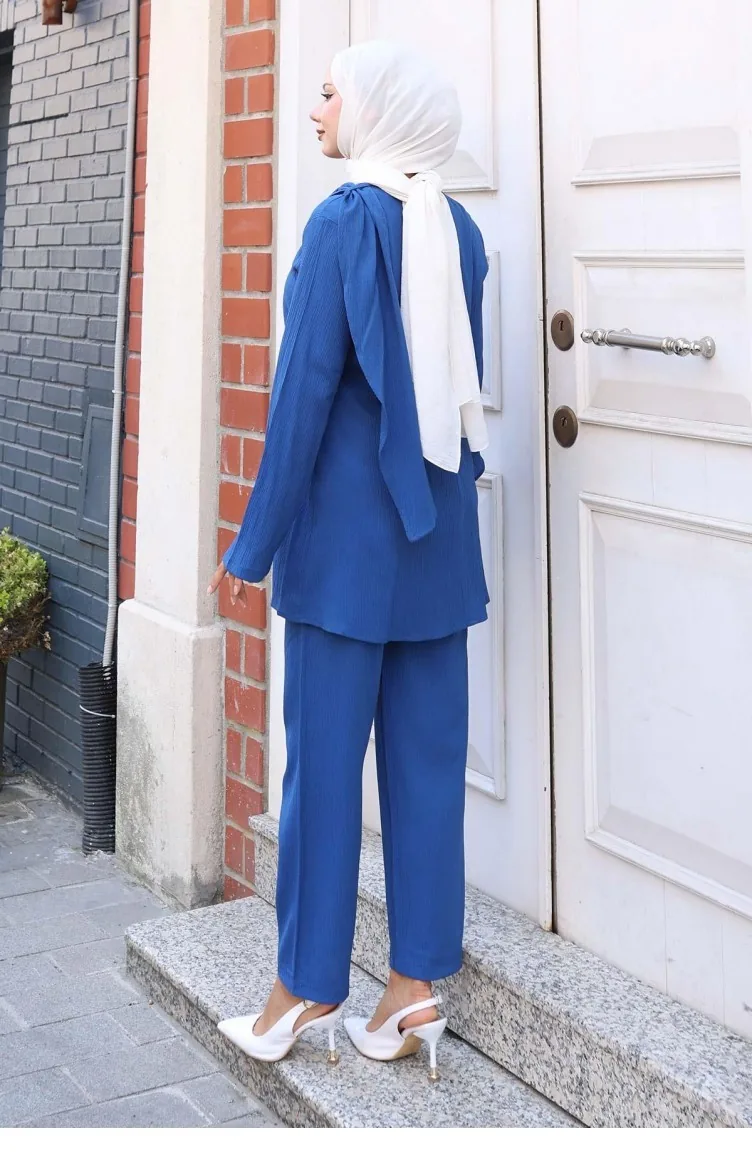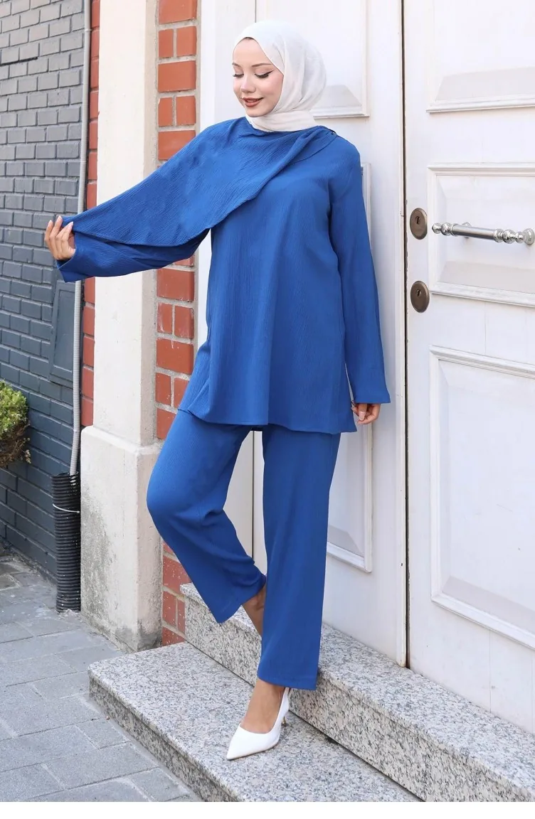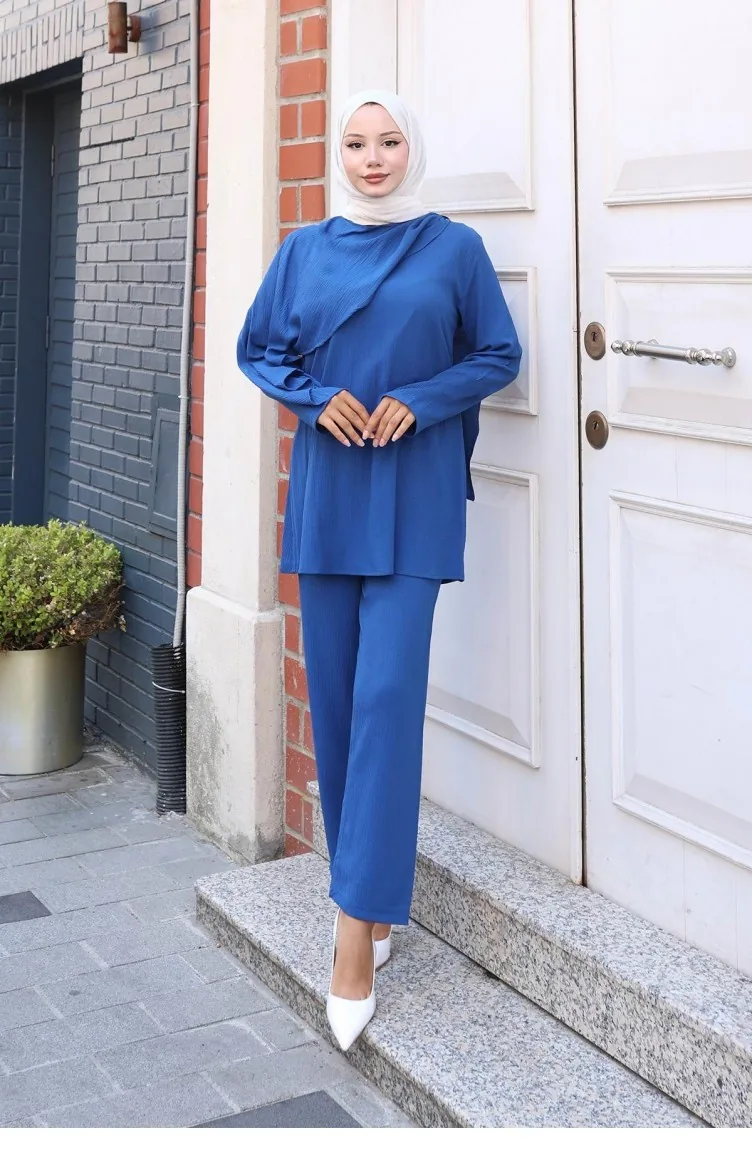 Indigo color is used. Polyester fabric often prevents wrinkling. It has a plain appearance. Suitable for 4 seasons. Plus size option available.