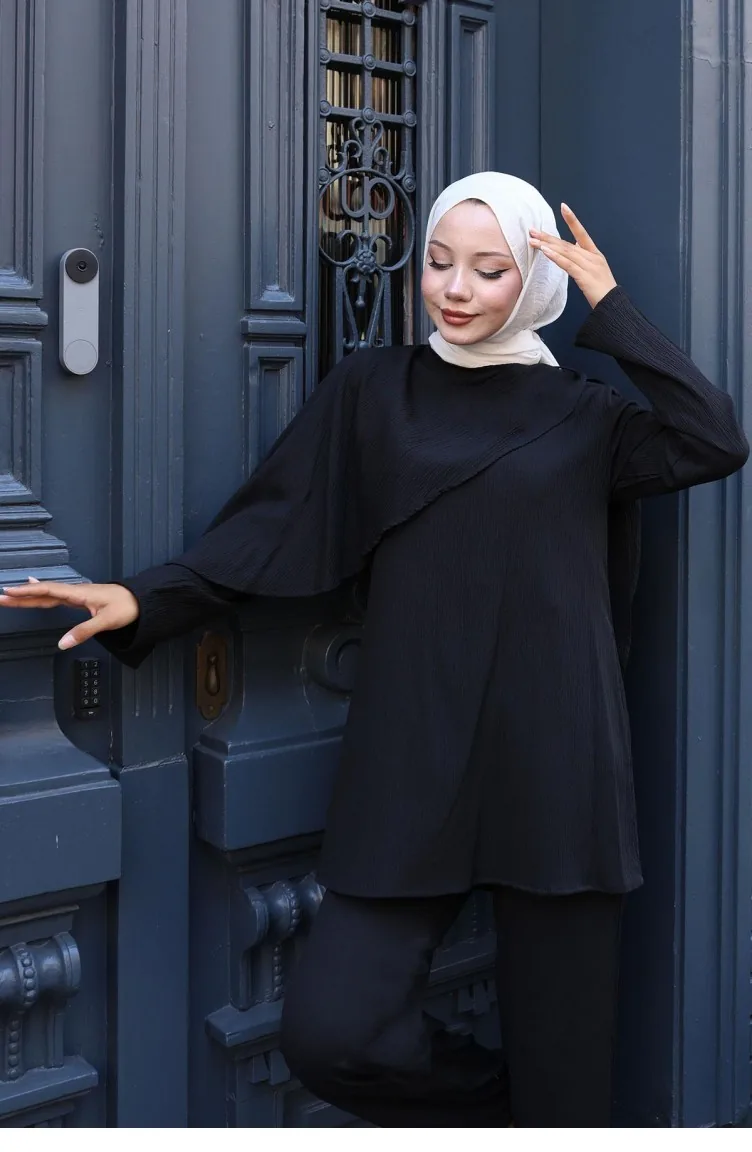 Black color is used. Polyester fabric often prevents wrinkling. It has a plain appearance. Suitable for 4 seasons. Plus size option available.