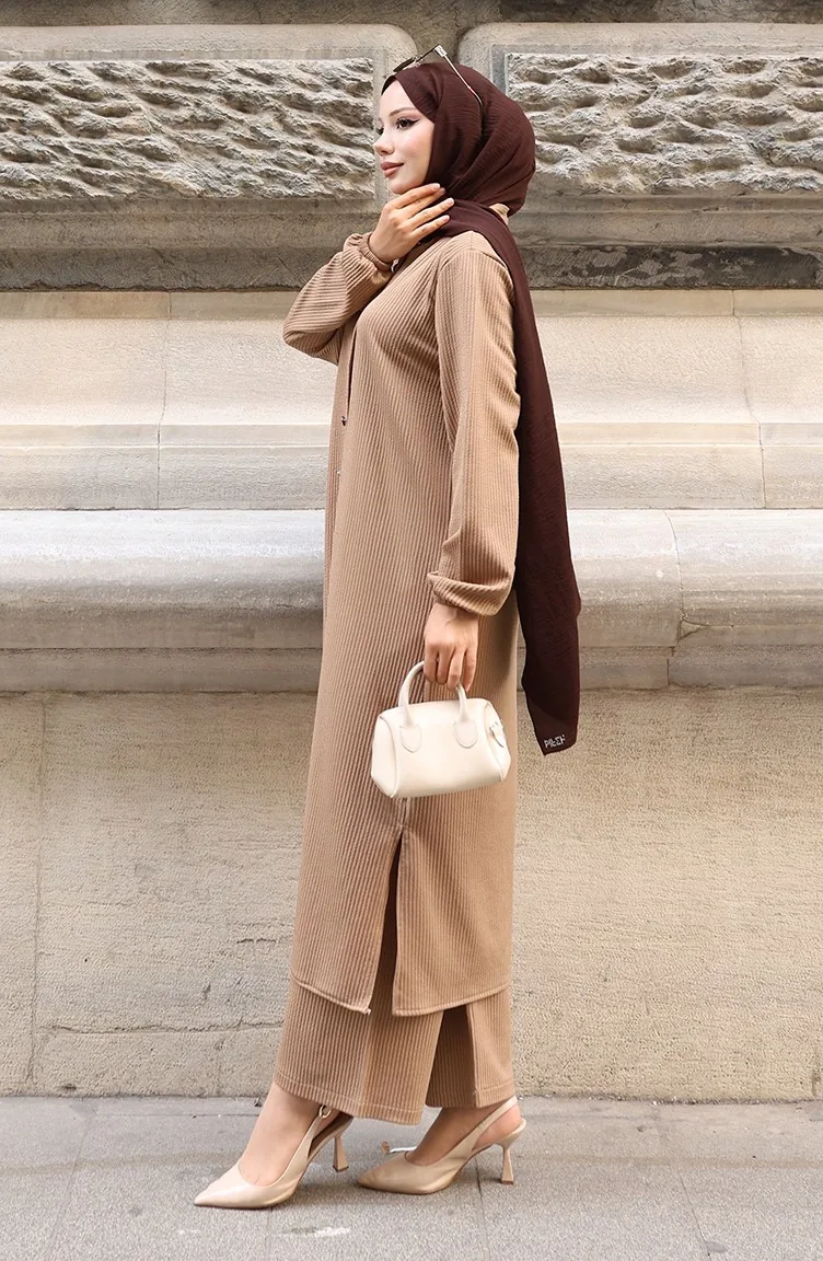 Corduroy Geknoopt Hijab Broekpak 2176-02 Melkkoffie 2176-02