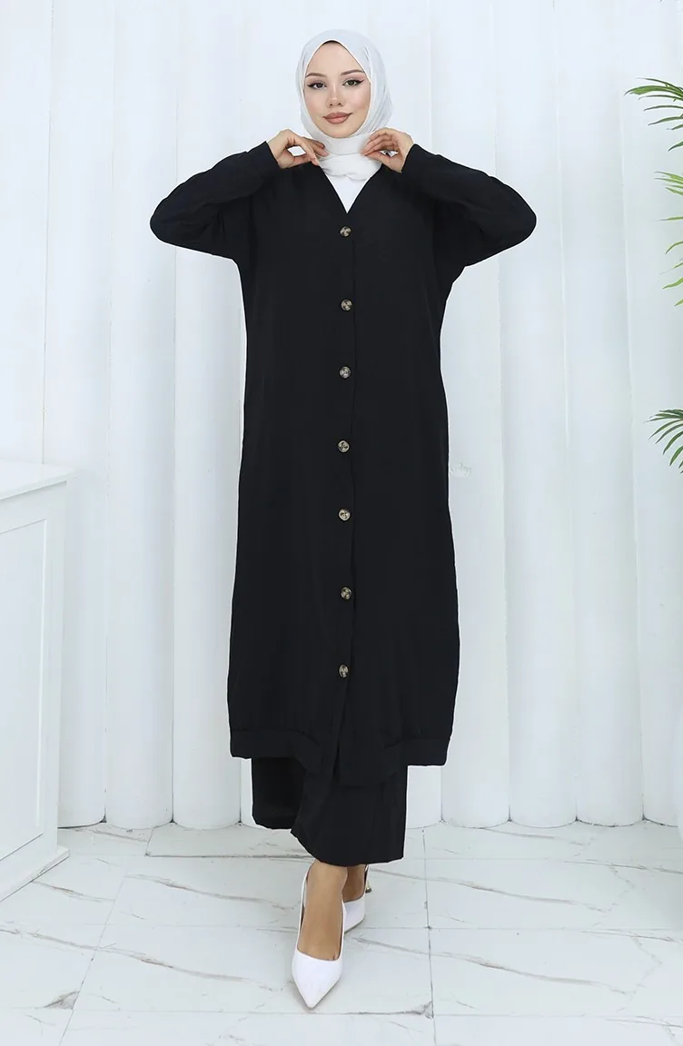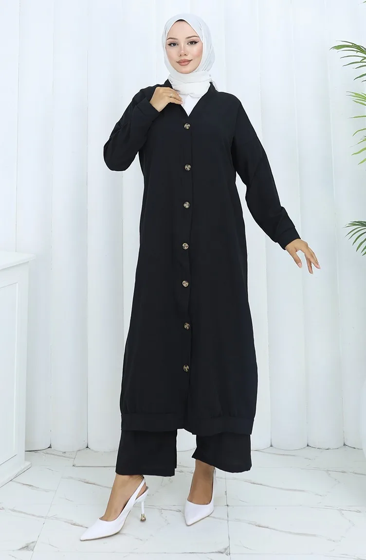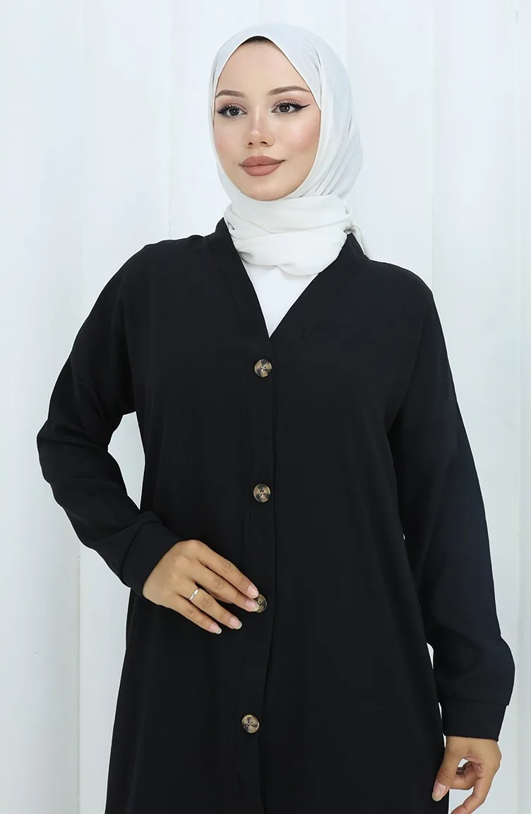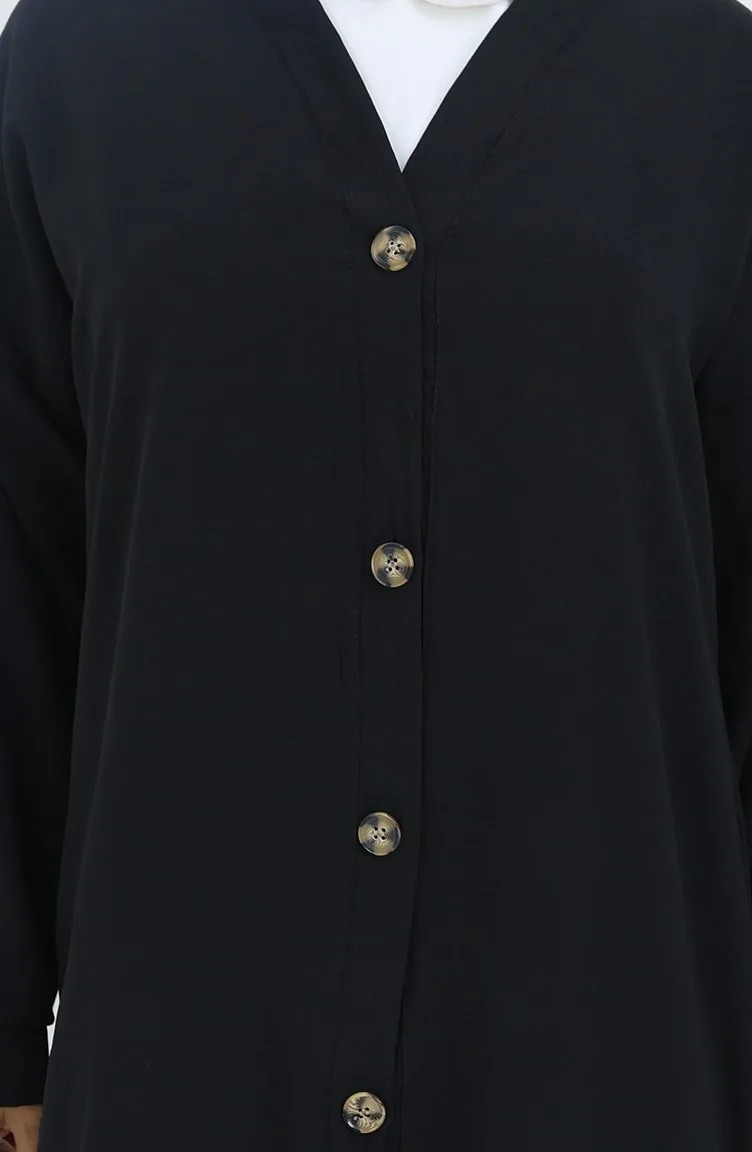 Black color is used. Aerobin. It has a plain appearance. Buttons have been used to make it easy to use. It is cut in the shape of a V-neck that adds a different air. Suitable for 4 seasons. Plus size option available.
