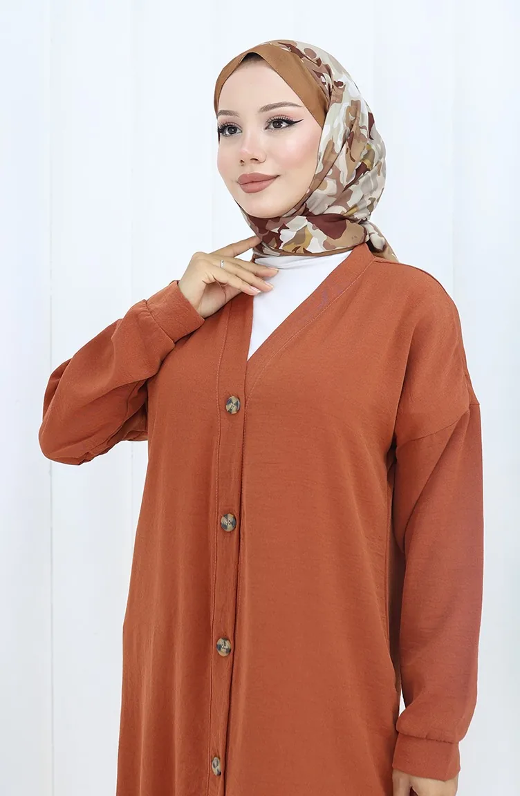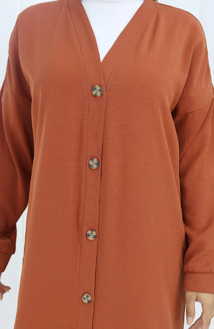 Aerobin. It has a plain appearance. Buttons have been used to make it easy to use. It is cut in the shape of a V-neck that adds a different air. Suitable for 4 seasons. Plus size option available.