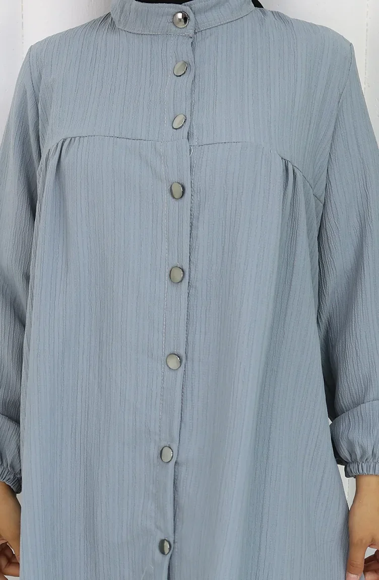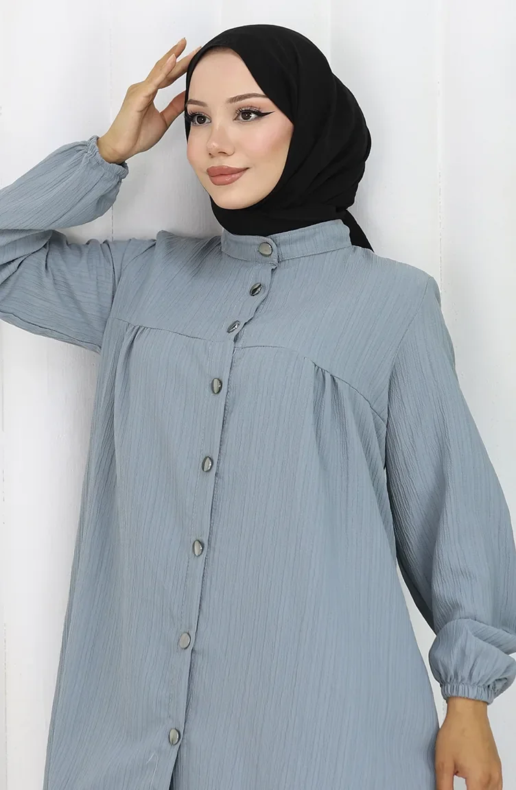 Gray color is used. The cotton fabric has an absorbent texture. It has a plain appearance. Buttons have been used to make it easy to use. Tippet collar is prefered. Suitable for 4 seasons. Plus size option available.