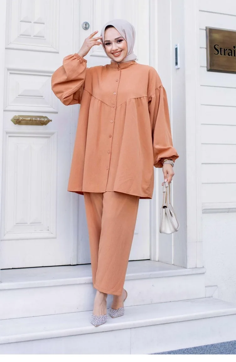 The camel color is used. Polyester fabric often prevents wrinkling. It has a plain appearance. Suitable for 4 seasons. Plus size option available.
