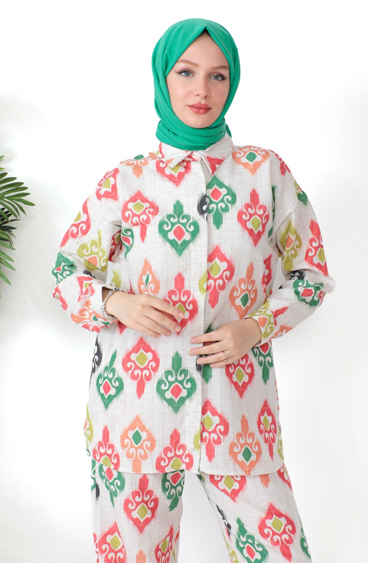 The linen fabric is resistant to heat and available in all seasons. Designed with patterned fabric. The product is used unlined. Long sleeve product. Designed for summer use. The size worn by the model, is the one on the image.