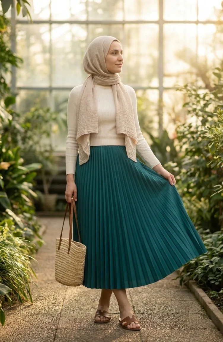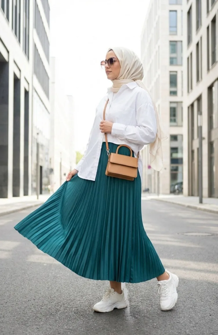 Oil Blue color is used. Polyester fabric often prevents wrinkling. It has a plain appearance. The product was made easier to use by using rubber. Suitable for 4 seasons. The size worn by the model, is the one on the image.