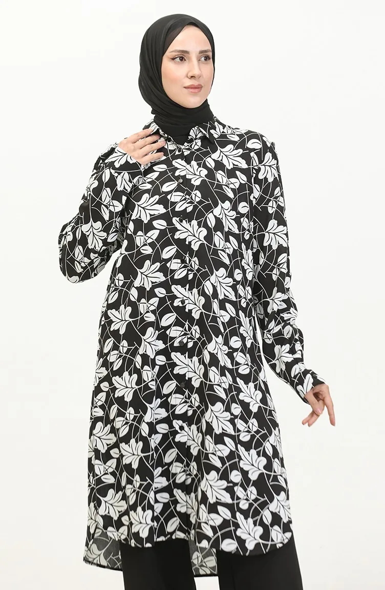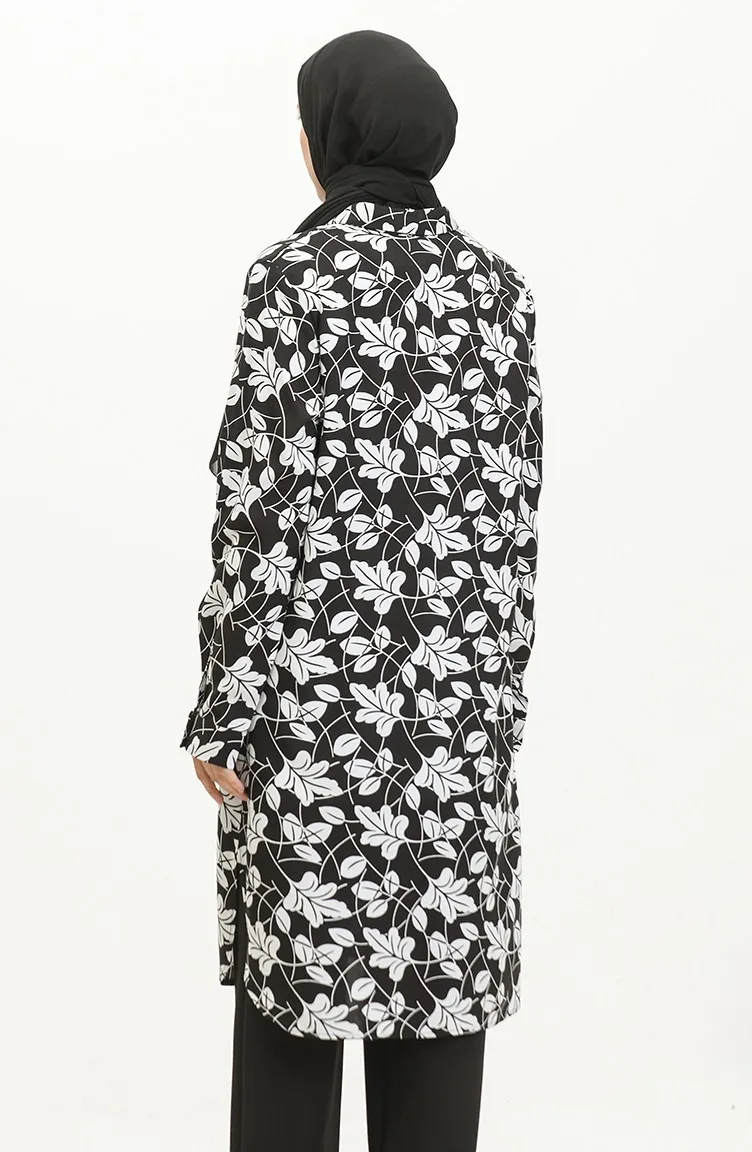 Black color is used. Viscose is a type of synthetic fabric and is convenient to use. Designed with patterned fabric. The product is used unlined. Long sleeve product. Suitable for 4 seasons. Plus size option available.
