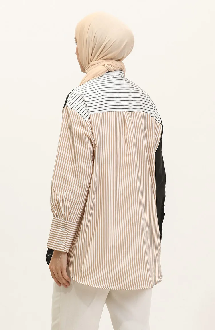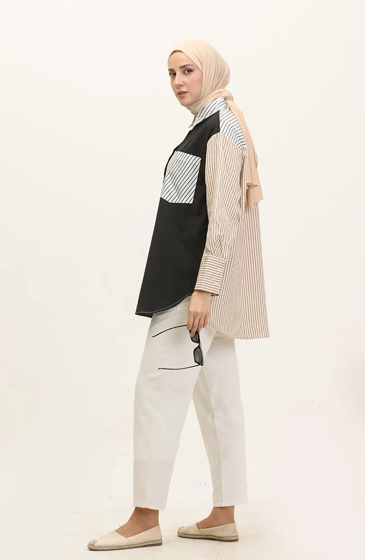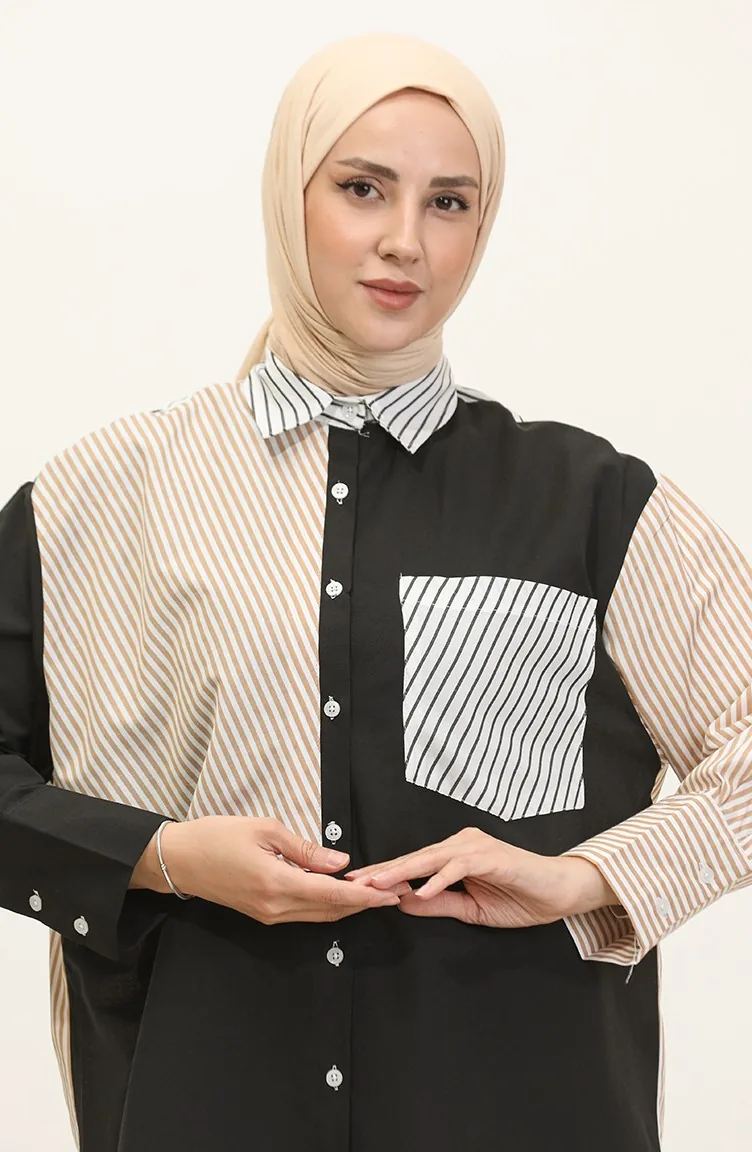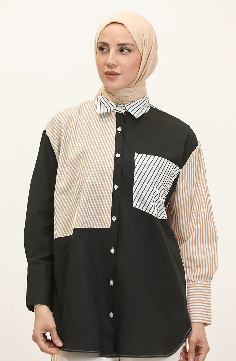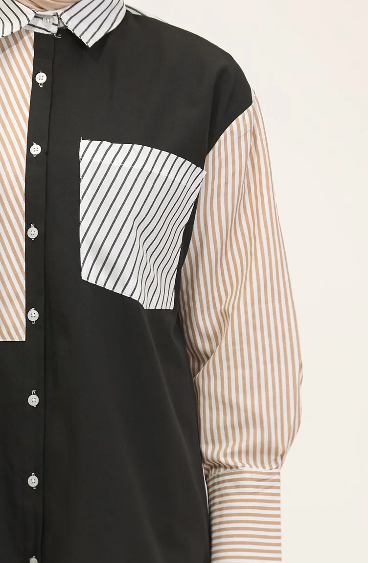 Black color is used. The cotton fabric has an absorbent texture. Designed with a striped fabric. The product is used unlined. Long sleeve product. Suitable for 4 seasons. Plus size option available.