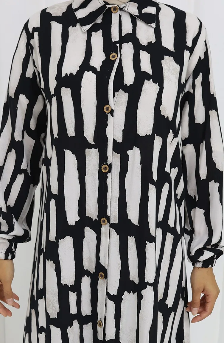 Black color is used. Viscose is a type of synthetic fabric and is convenient to use. It has a plain appearance. Buttons have been used to make it easy to use. It's made of elastic sleeves. Suitable for 4 seasons. Plus size option available.