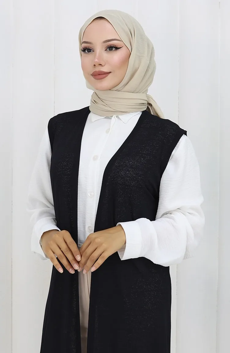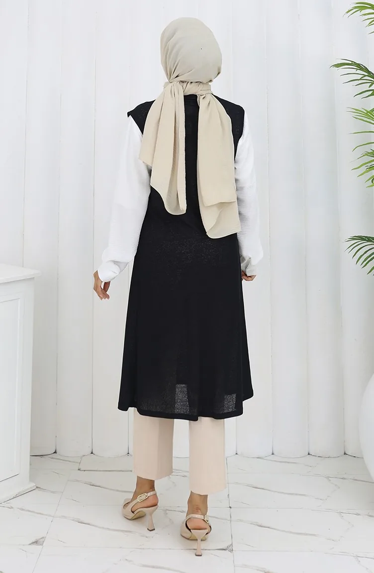 Dark Navy Blue color is used. Knitted fabric is used. It has a plain appearance. The product is used unlined. It's a sleeveless product. Plus size option available.