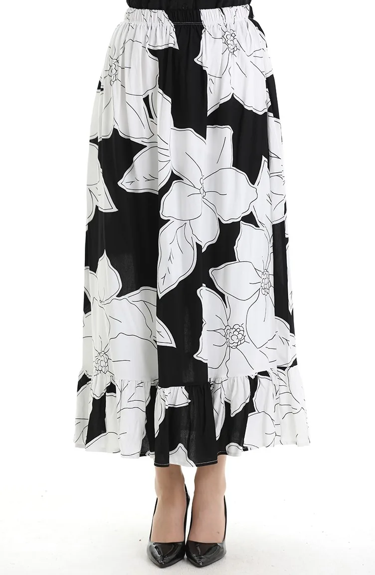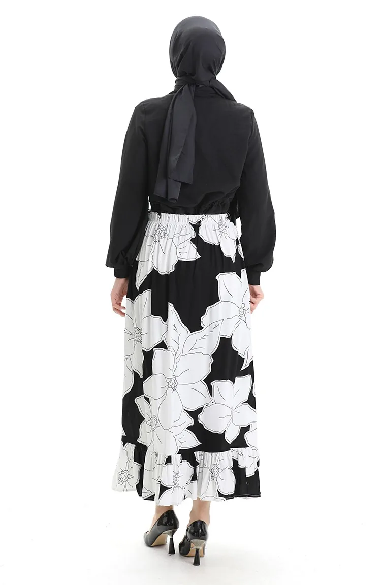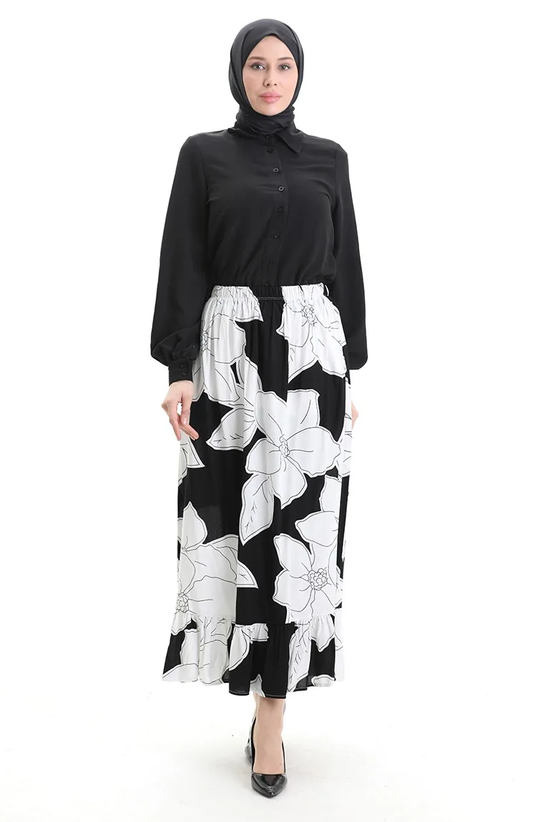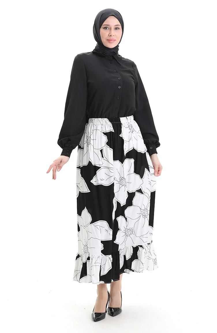 Black color is used. Viscose is a type of synthetic fabric and is convenient to use. Designed with patterned fabric. It has ruffle detail. Suitable for 4 seasons. Length is adjusted according to standard size measurements.