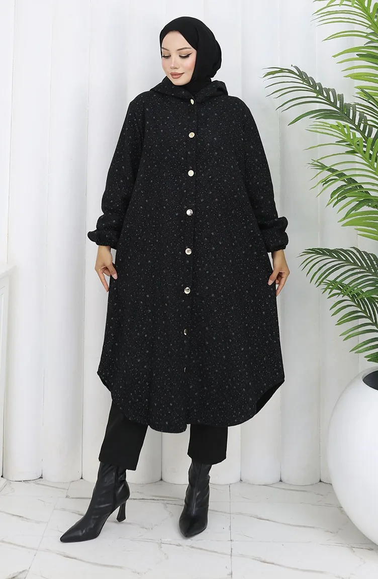 Black color is used. It is cachet fabric, you can use it easily in winter. Designed with patterned fabric. It's made of elastic sleeves. Designed from thick fabric. Plus size option available.