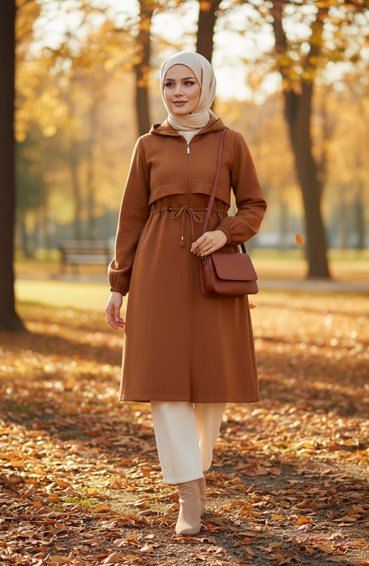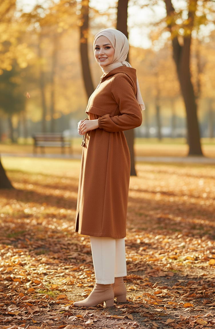 Tobacco color is used. It is cachet fabric, you can use it easily in winter. It has a plain appearance. The product is used unlined. It's made of elastic sleeves. Designed from thick fabric. Plus size option available.