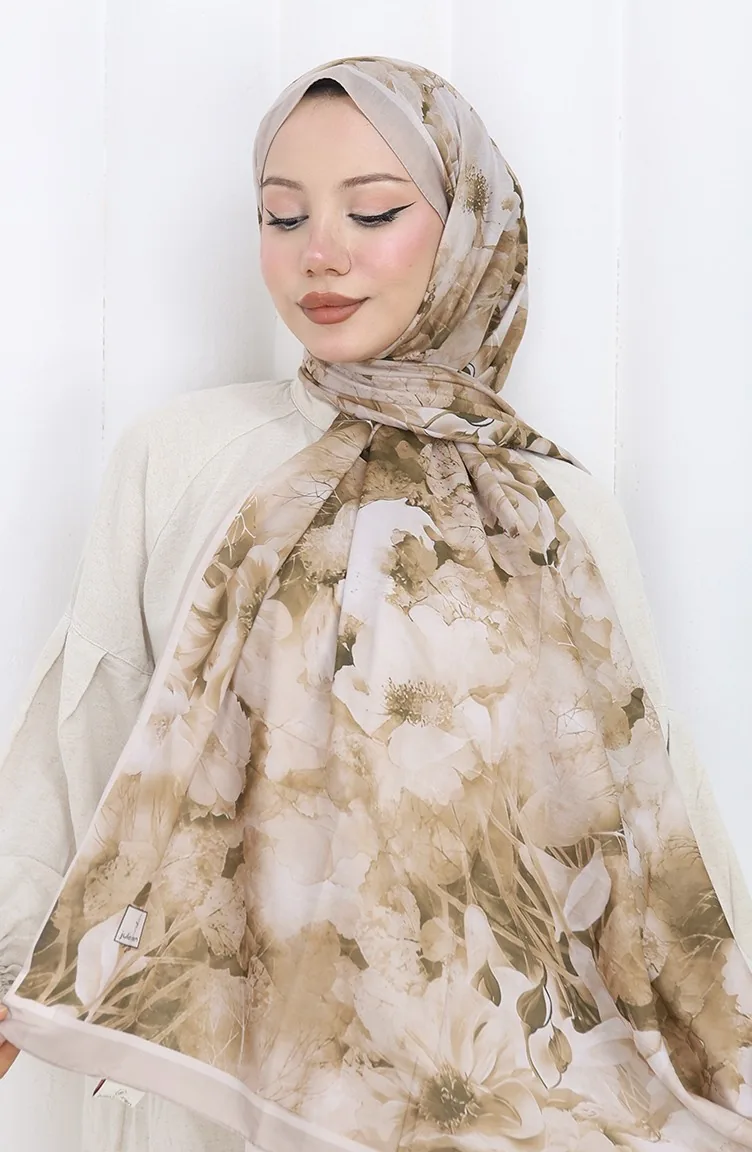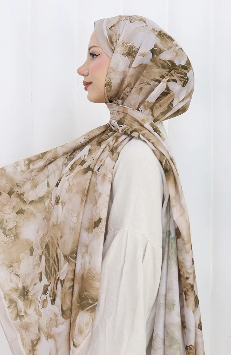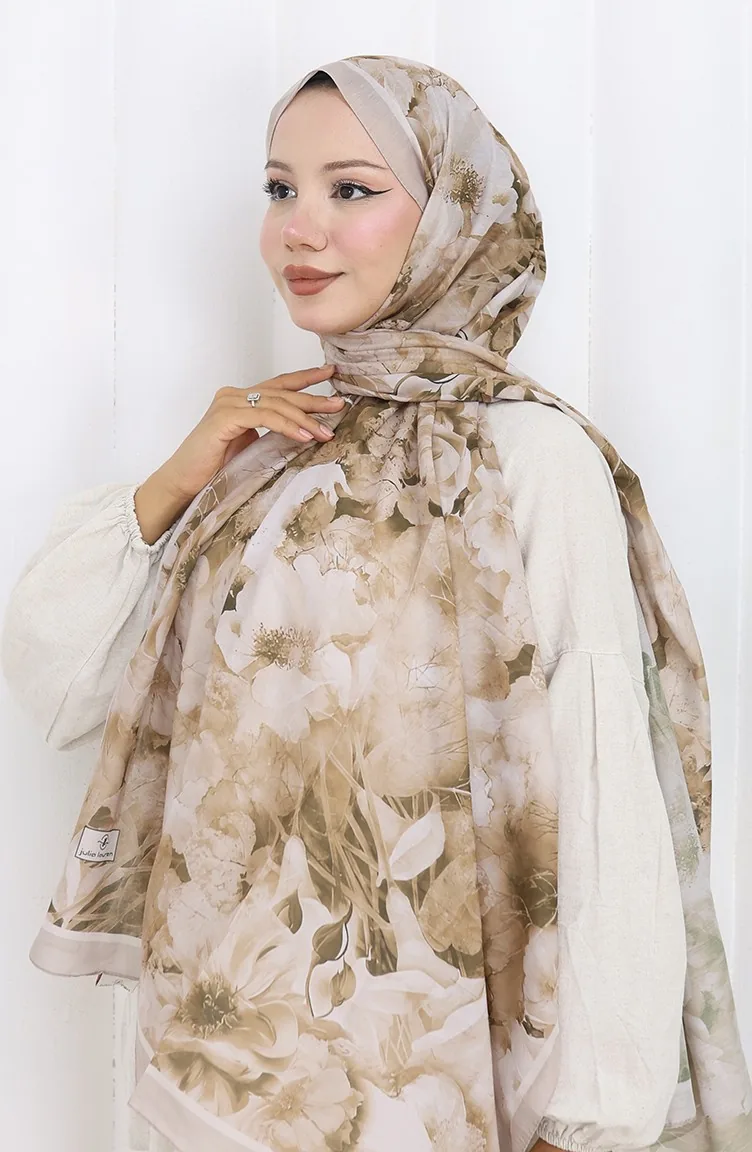 Pamuklu Desenli Koza Şal 70324-11 Bej Vizon