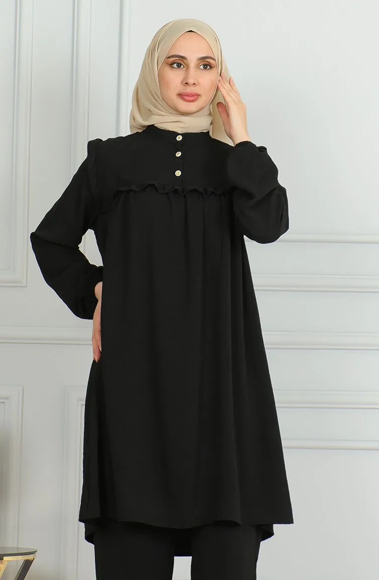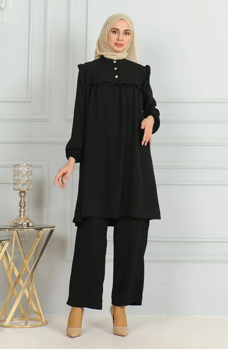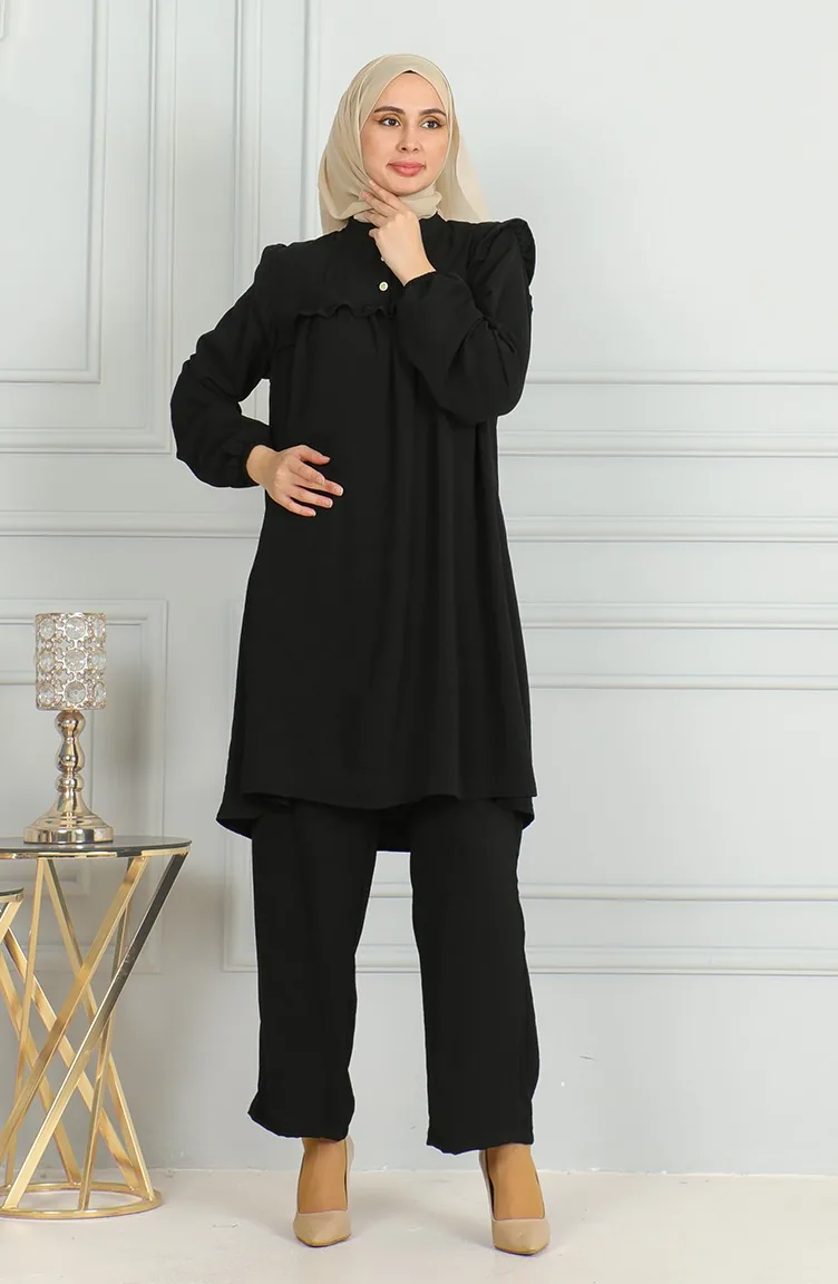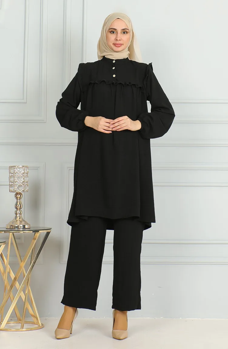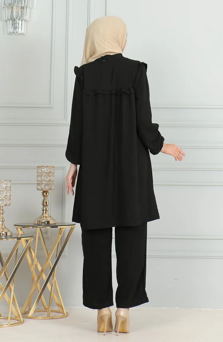 Aerobin Kumaş Fırfırlı Tunik Pantolon İkili Takım 1009-03 Siyah