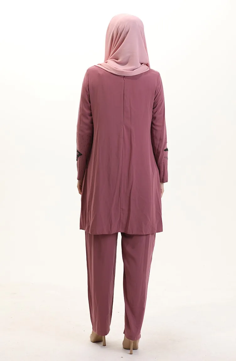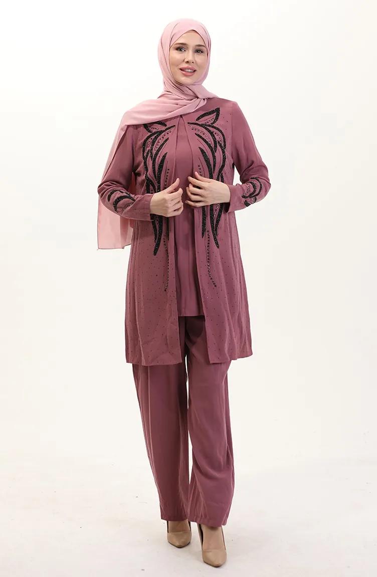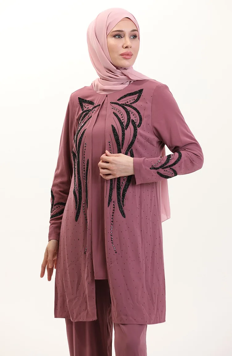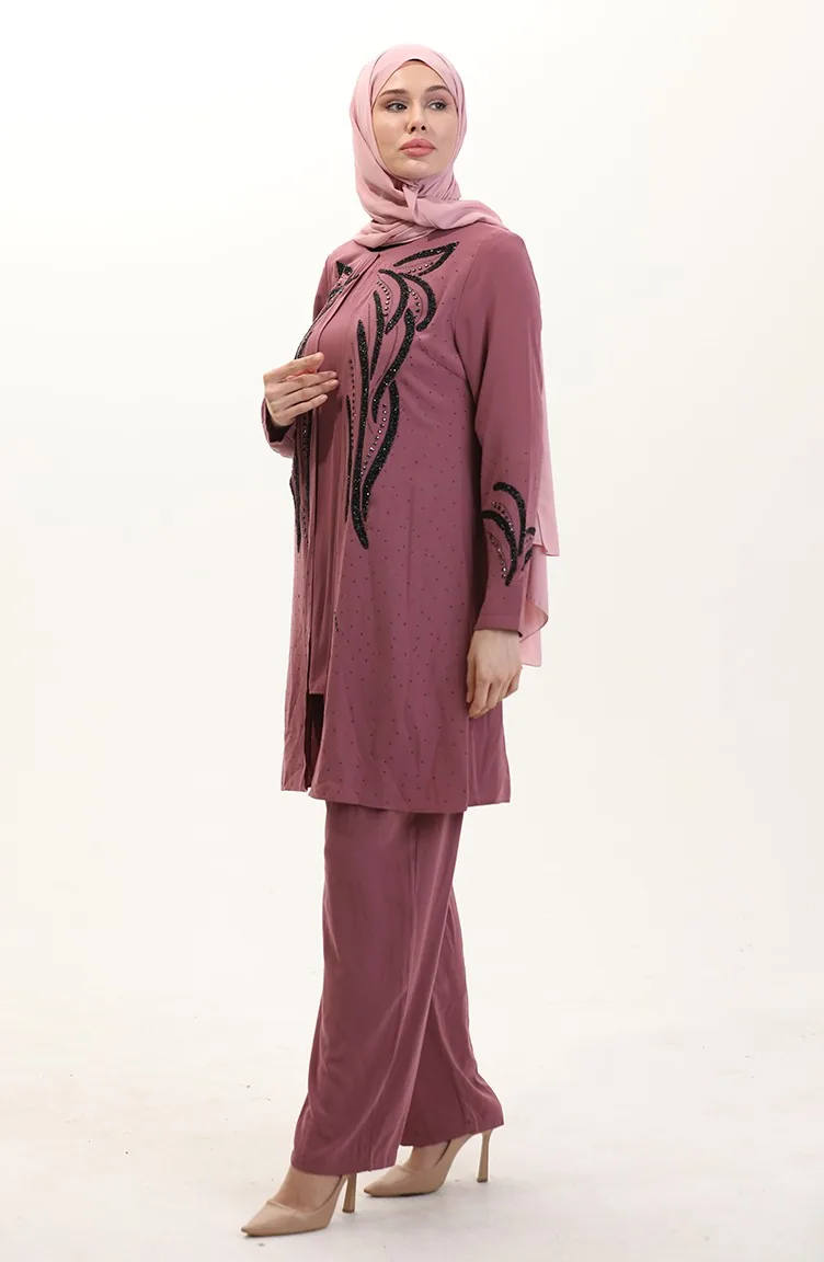 Büyük Beden Taşlı Tunik Pantolon İkili Takım 6210-03 Gül Kurusu