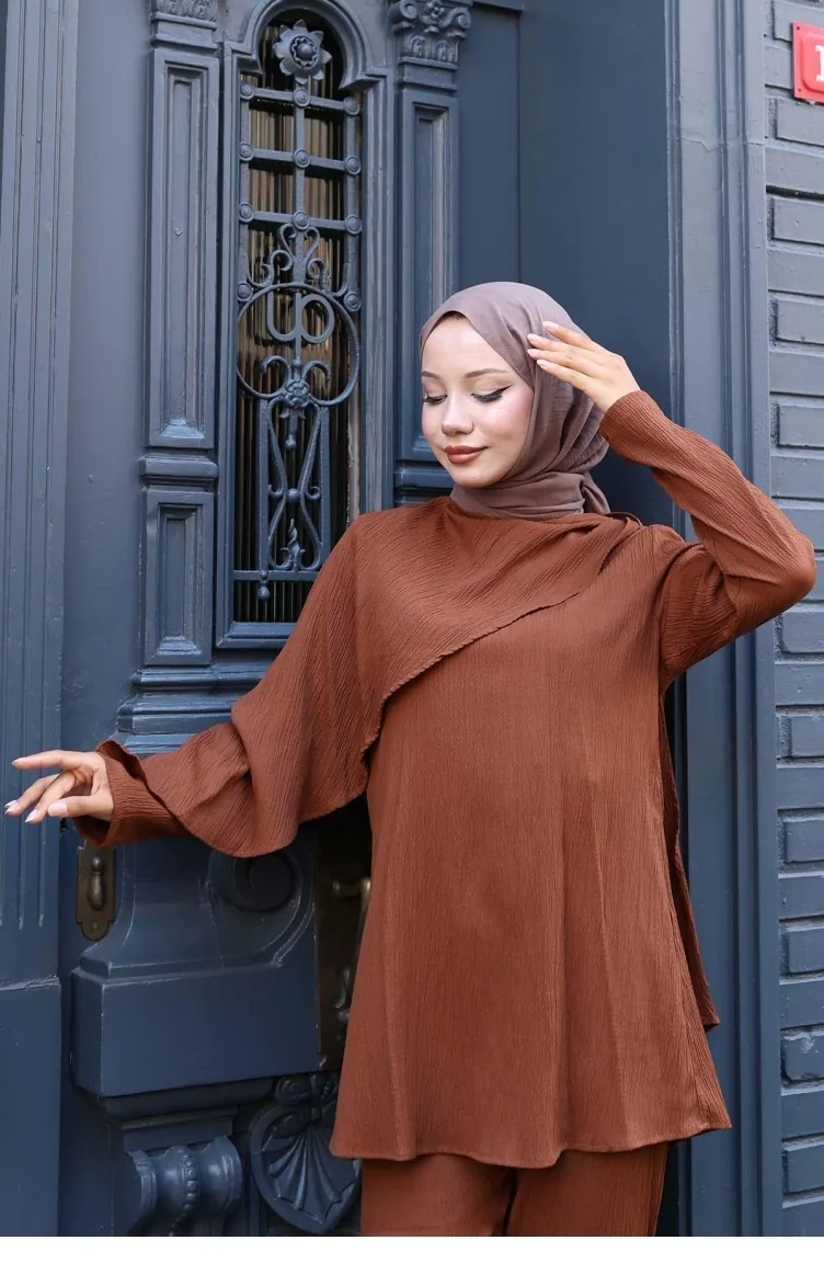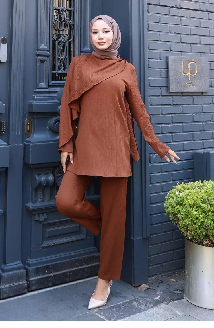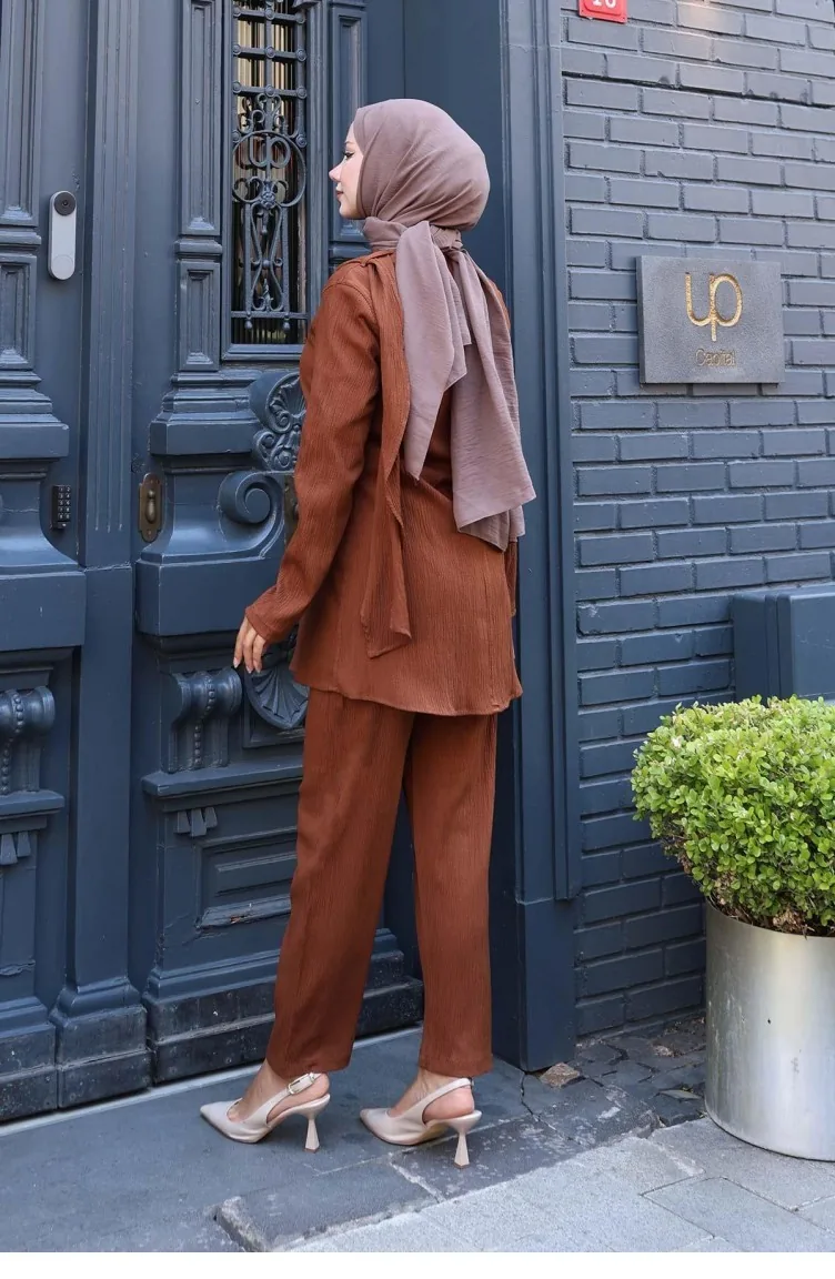 Kahverengi renktedir. Polyester kumaş. Sade. 4 Mevsim tercih edebilirsiniz. Büyük beden seçeneği mevcuttur.