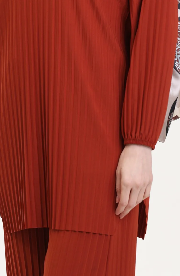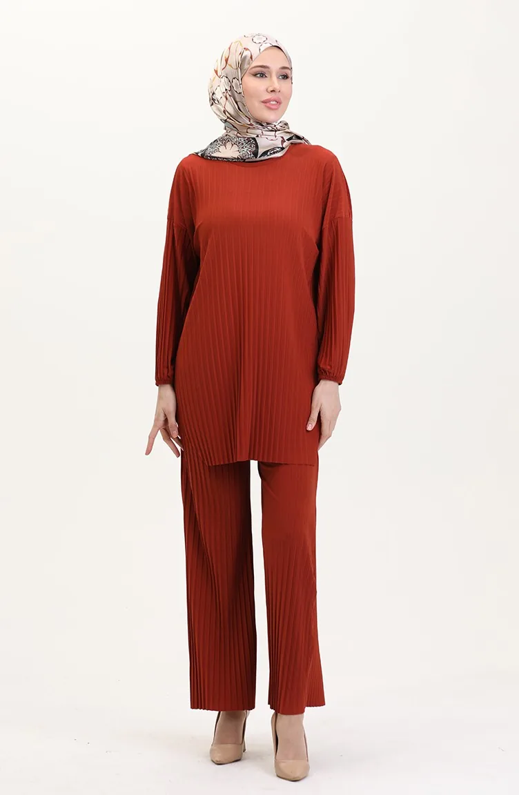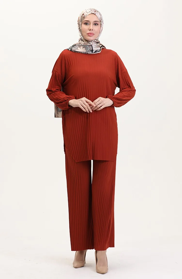 Sandy Kumaş Pileli Tunik Pantolon İkili Takım 0004-05 Kiremit