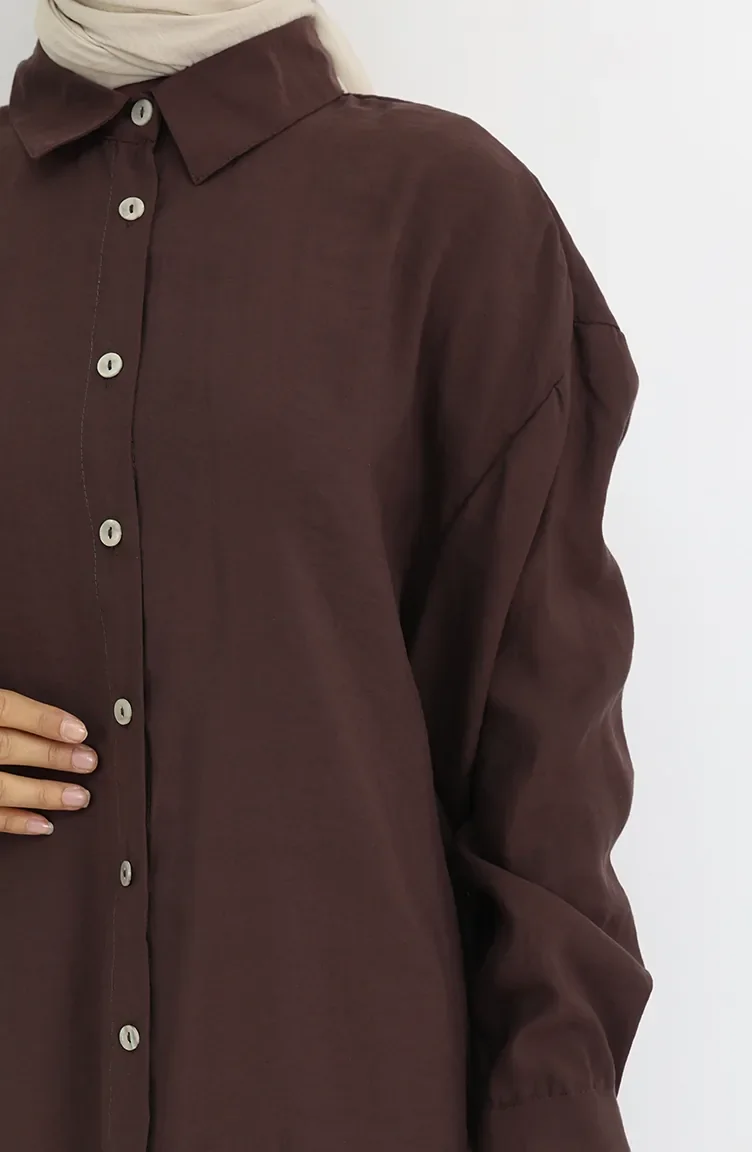 Hijab (tesettür) stilinde hem şık hem de konforlu bir seçenek arayanlar için: kahverengi tunik pantolon ikili takım. Islamic clothing (İslami giyim) anlayışına uygun bol kesim (salaş) kalıbı, gün boyu rahatlık sunar. Dökümlü kumaşı (Aerobin veya Krep olabilir) sayesinde mevsimlik (4 mevsim) kullanımda terletmez.