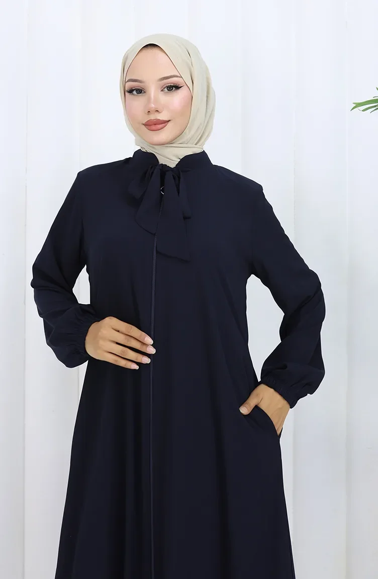 Lacivert renktedir. Medine ipeği kullanılmıştır. Sade. Fermuarlı. 4 Mevsim tercih edebilirsiniz. Büyük beden seçeneği mevcuttur.