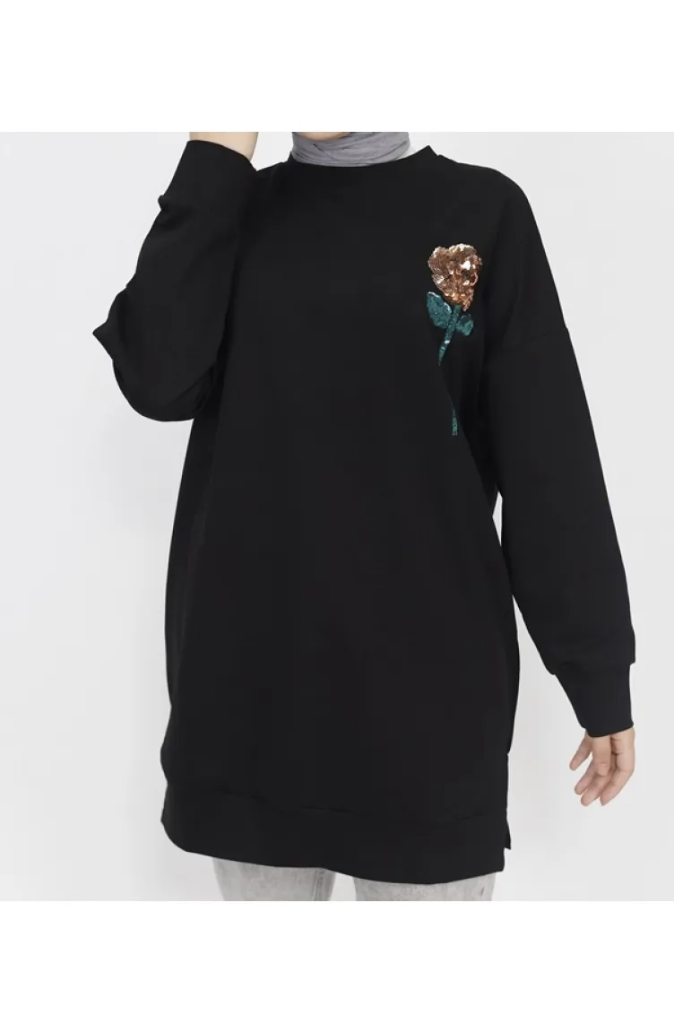 2 İp Kumaş Pul İşleme Detaylı Sweatshirt 6972-03 Siyah