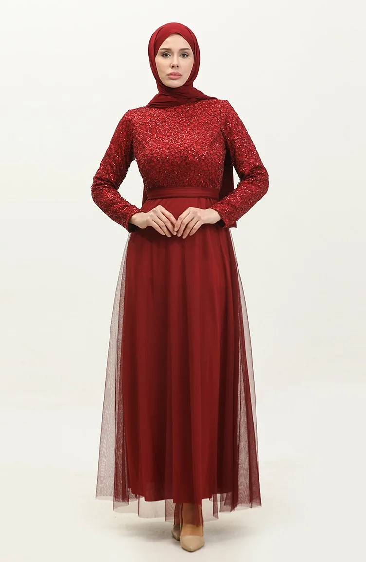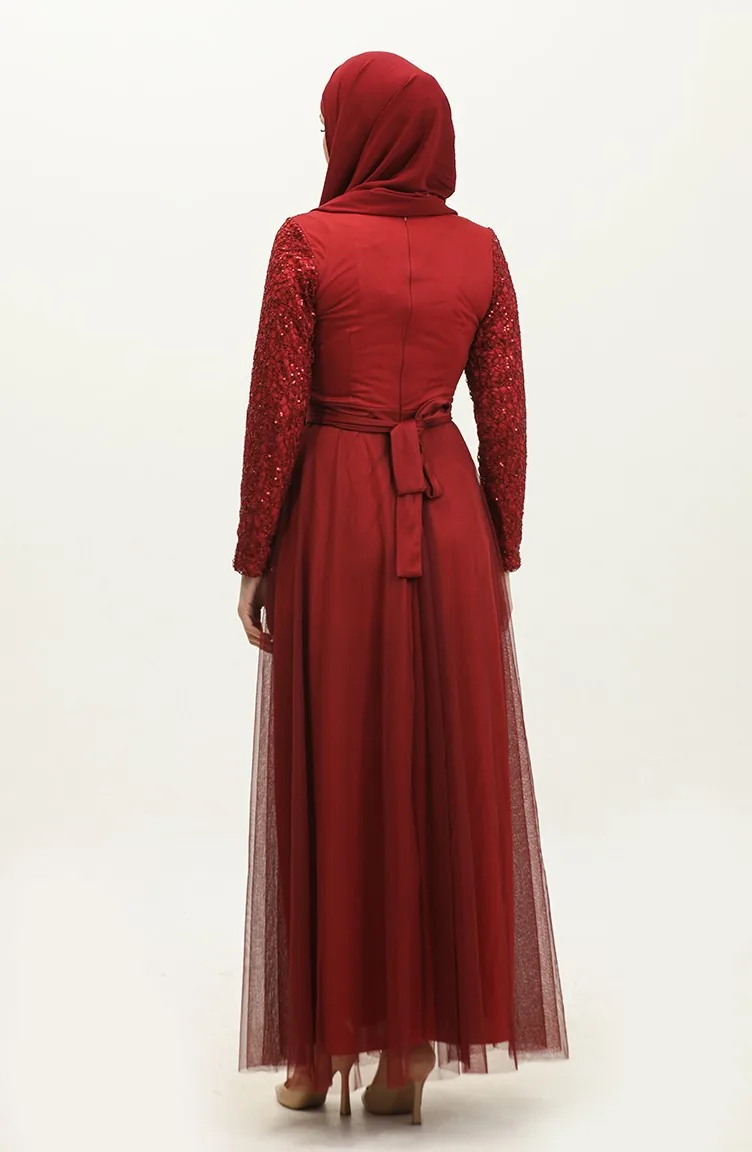 Dantelli Kuşaklı Abiye Elbise 5353A-05 Bordo