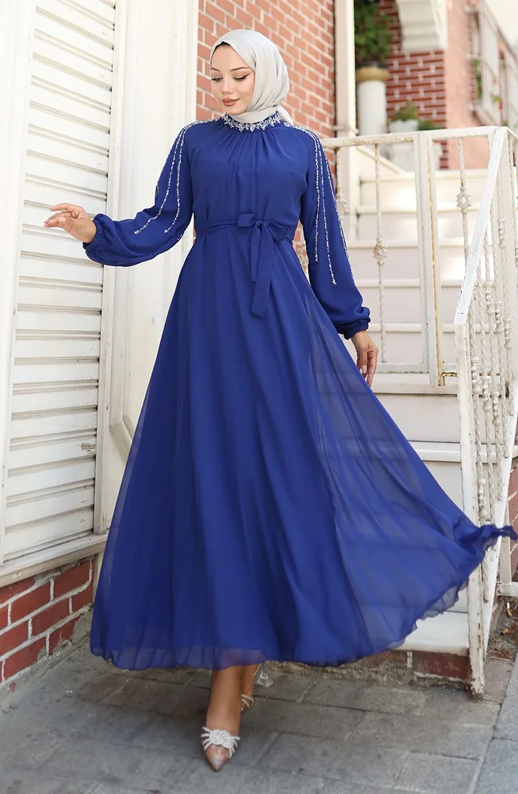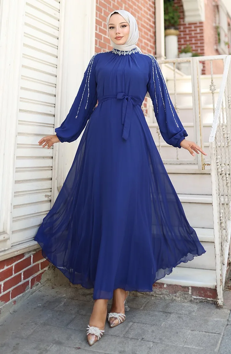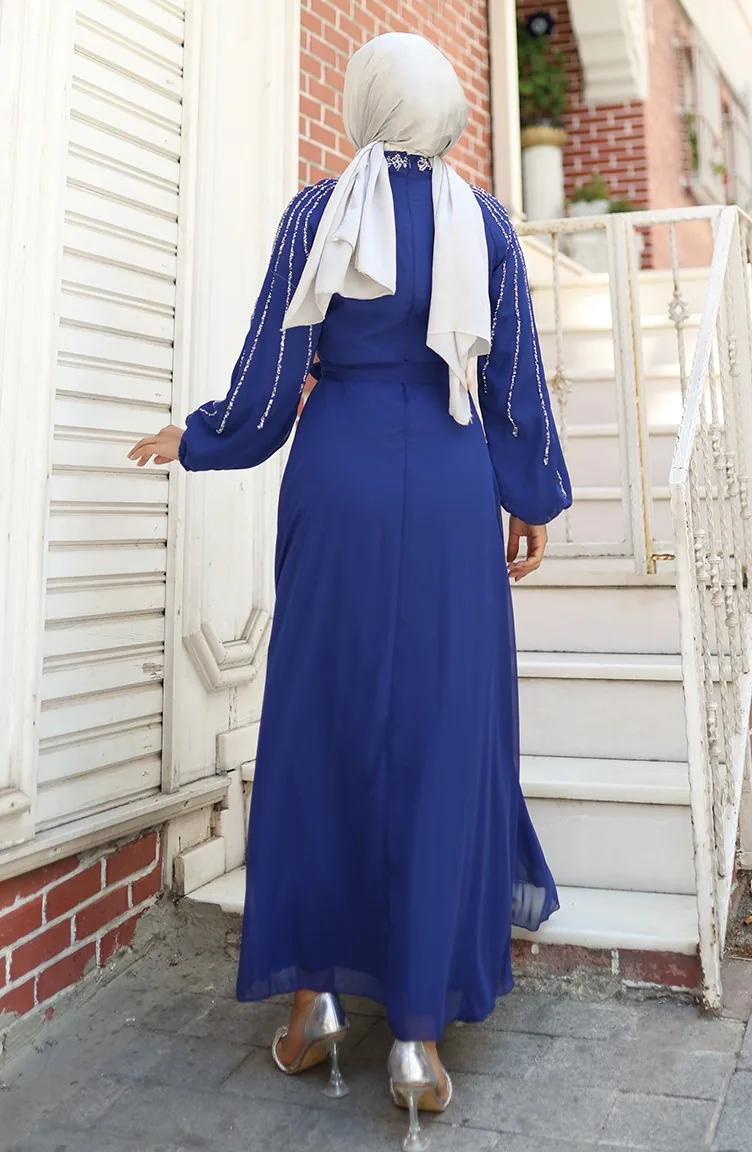 Kolu Taşlı Şifon Abiye Elbise 5804-03 Saks