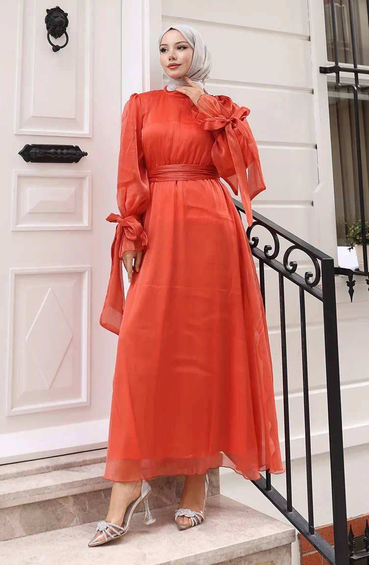 Hijab (tesettür) stilinin en enerjik ve en romantik abiye parçası: oranj (kiremit/turuncu) organze tül elbise. Islamic clothing (İslami giyim) anlayışına uygun bol kesim (kloş) kalıbı, modest dress (abiye elbise) zarafetini sunar. Lüks organze tül kumaşı, özel günler için mükemmel bir hafiflik ve hacim sağlar.