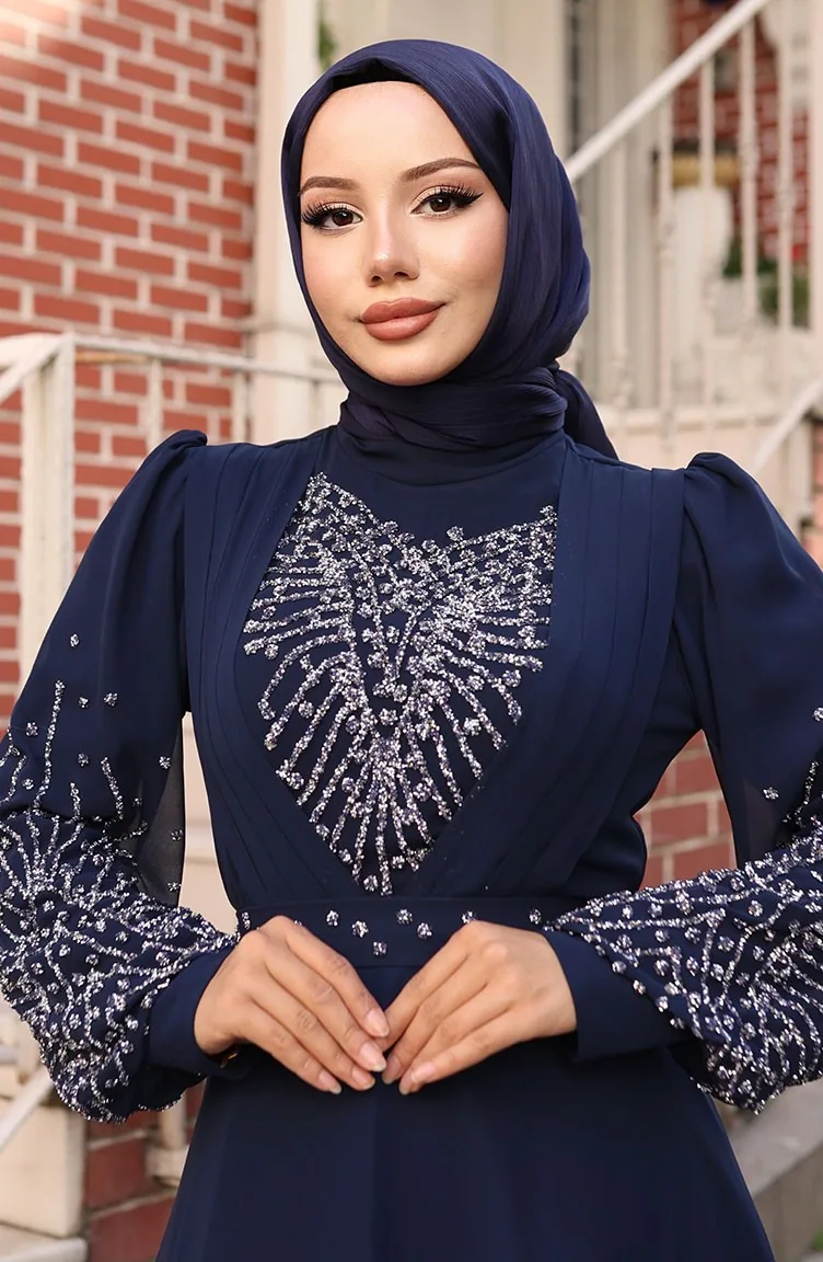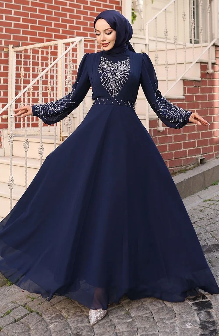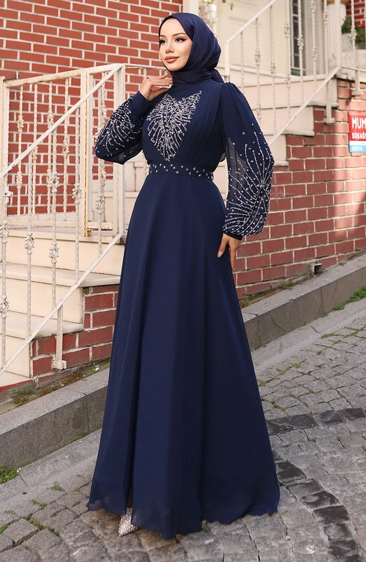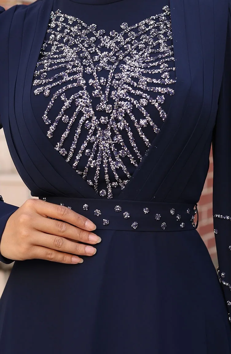 Şifon Taşlı Abiye Elbise 6237-02 Lacivert