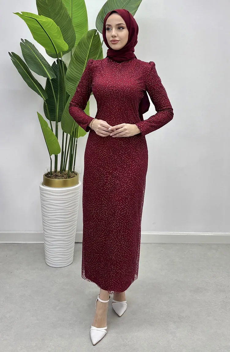 Simli Tül Abiye Elbise 5517-04 Bordo