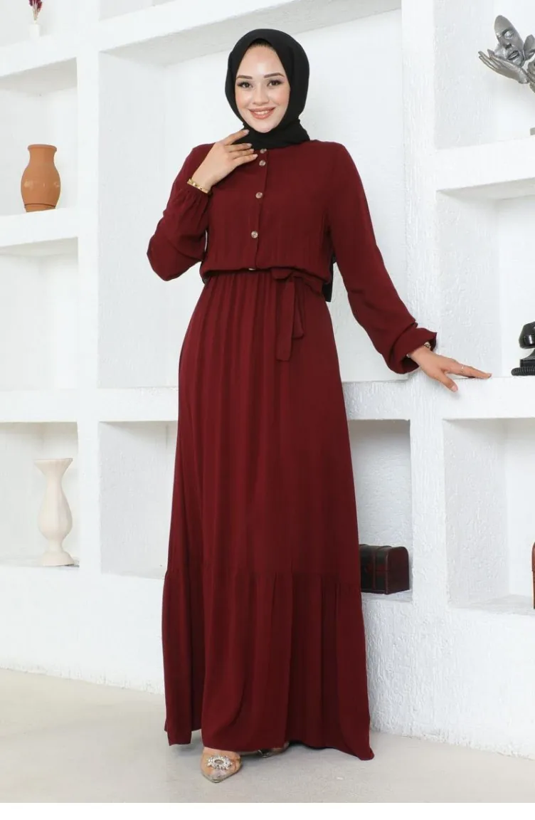 1122Sgs Düğme Detaylı Viskon Elbise Bordo