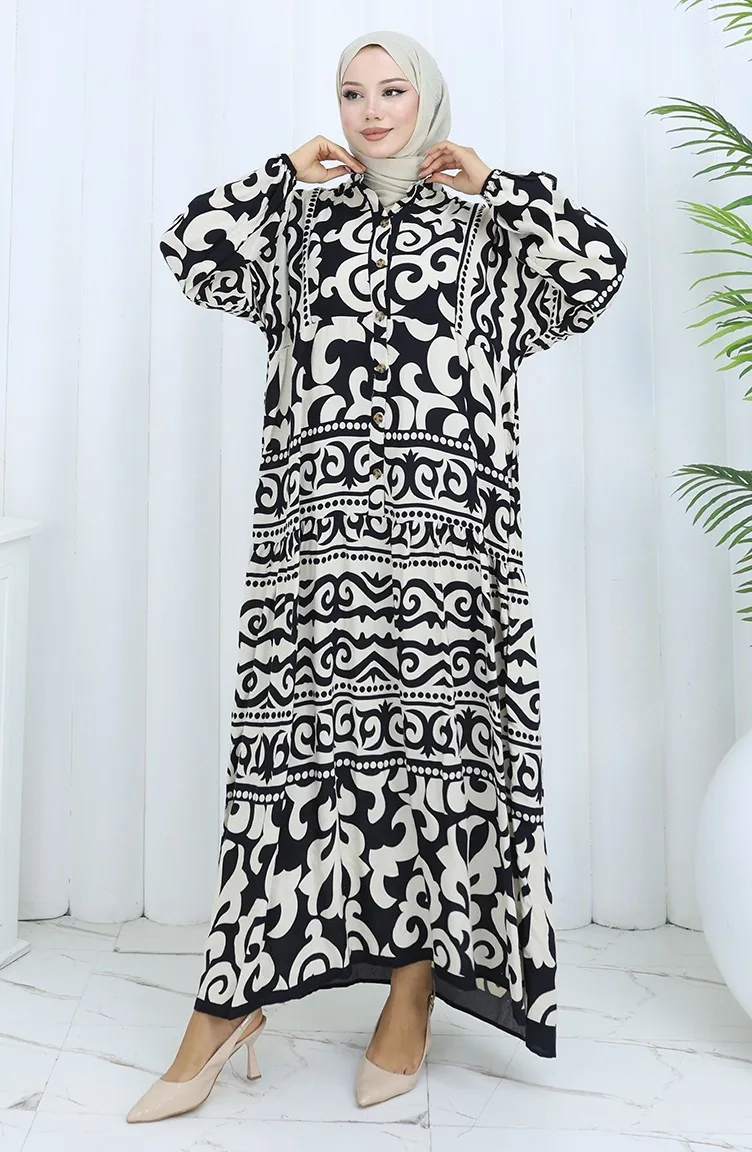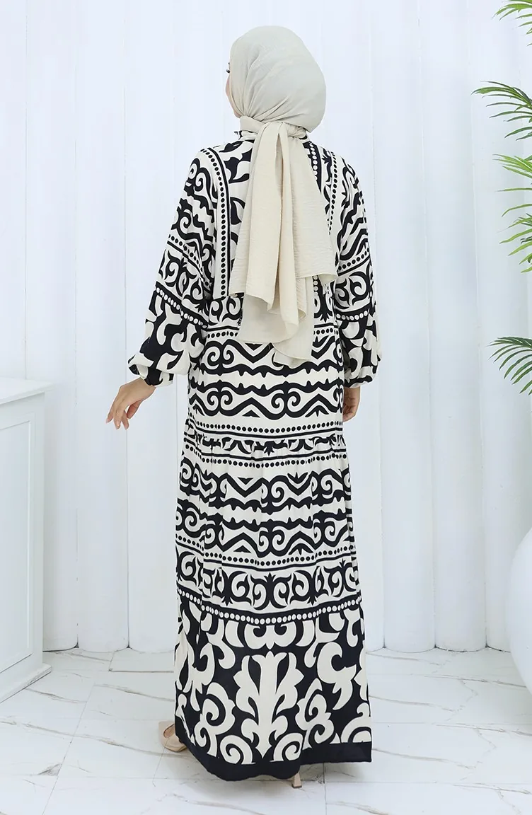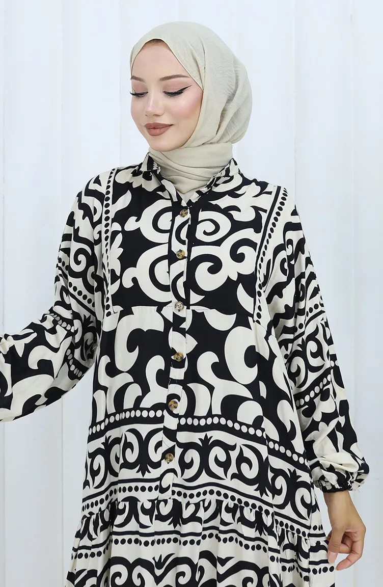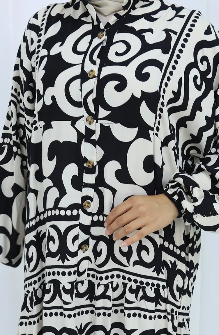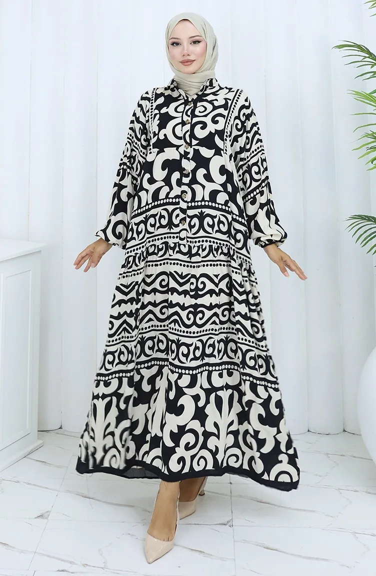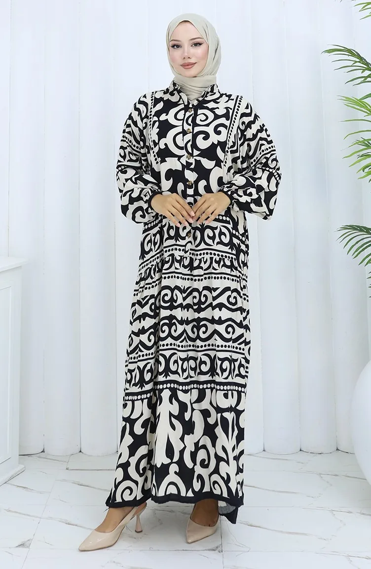 Alaçatı Desen Yarım Düğmeli Elbise 2137-03 Siyah Krem
